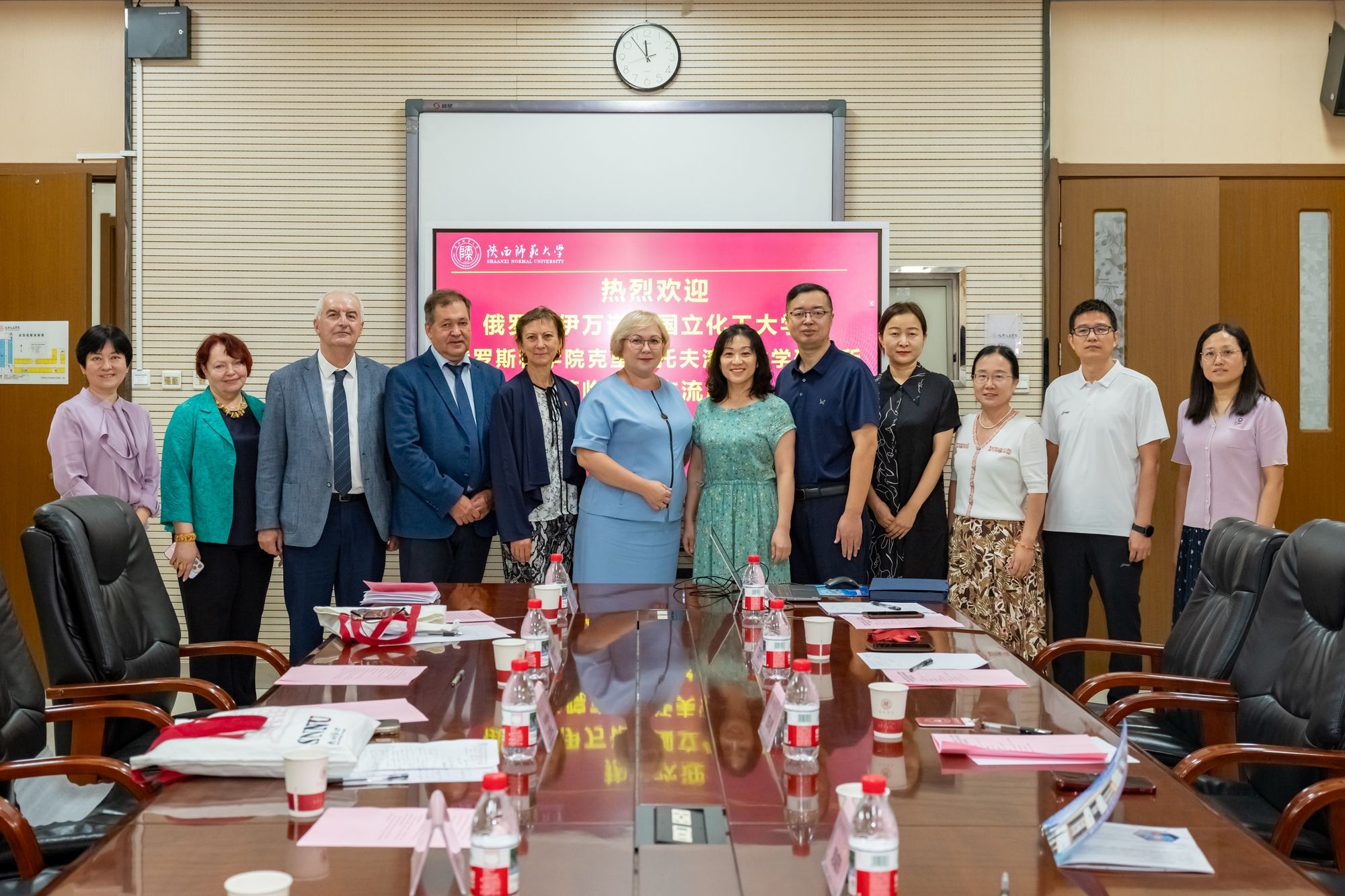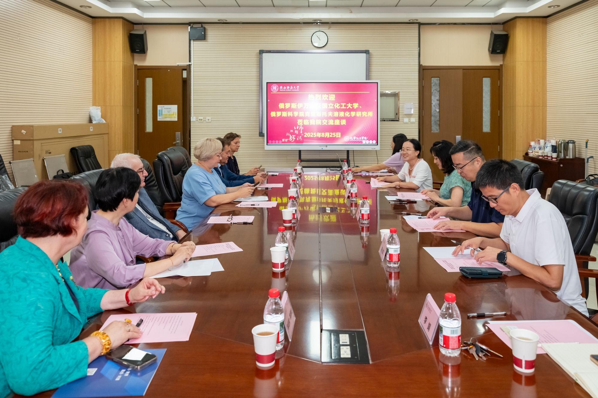 8月25日上午,俄罗斯伊万诺沃国立化工大学Natalya Gordina校长、Tatyana R. Usacheva教授,俄罗斯科学院克里斯托夫溶液化学研究所Nugzar Zhoraevich Mamardashvili 教授、 Sergey Aleksandrovich Syrbu教授,应邀来我院进行学术交流与座谈,共商合作。座谈会在致知楼1362会议室进行,学院书记高玲香、院长刘成辉、副院长丁立平、翟全国,国际交流与合作处副处长李娟,外国语学院教授孟霞和娜塔莉 • 察廖娃等参加座谈会,座谈会由丁立平主持。