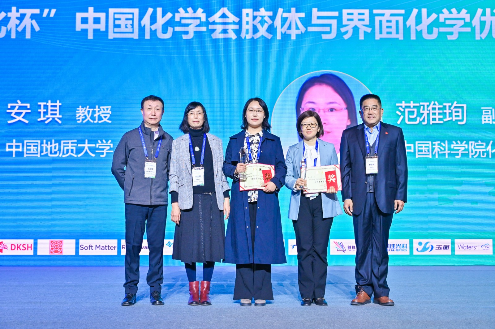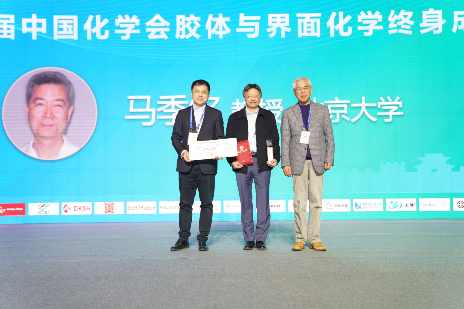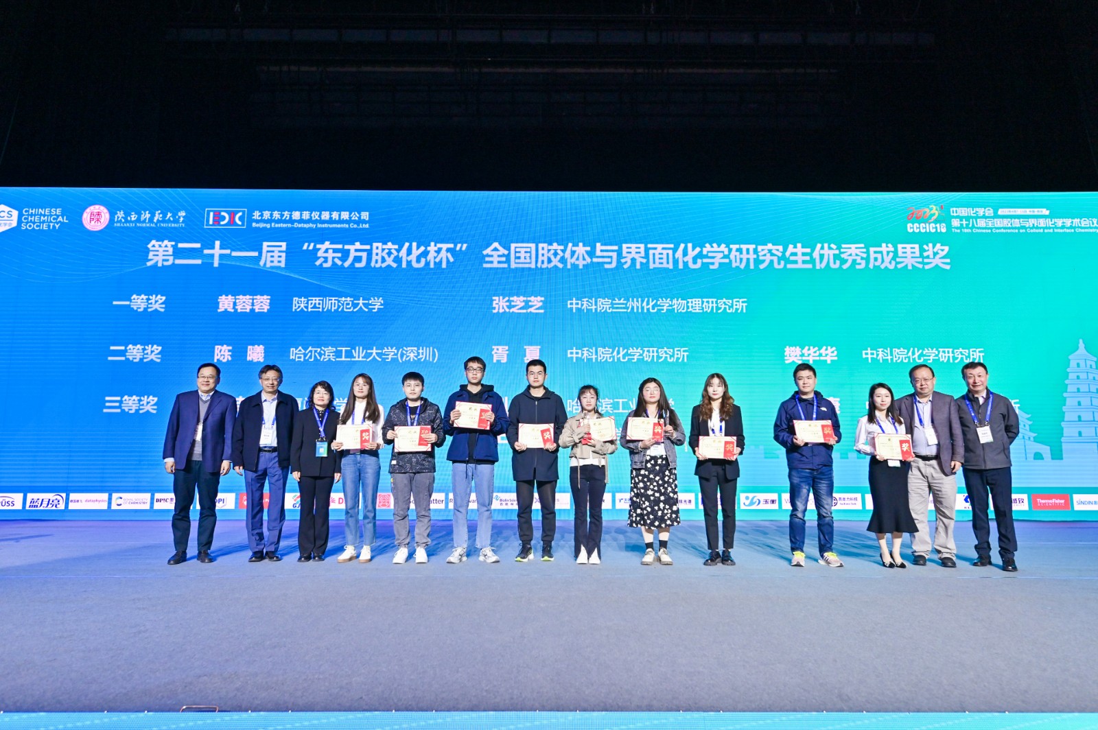 开幕式上隆重颁发了胶体与界面化学领域四个标志性奖项。中国科学院化学研究所刘鸣华研究员主持颁奖典礼。北京大学马季铭教授获第三届中国化学会胶体与界面化学终身成就奖,山东大学郝京诚教授、中国科学院化学研究所王毅林研究员获2021年度中国化学会胶体与界面化学杰出贡献奖,清华大学李广涛教授、吉林大学吴立新教授获2023年度中国化学会胶体与界面化学杰出贡献奖,中国地质大学(北京)安琪教授、中科科学院化学研究所范雅珣副研究员获第六届“东方胶化杯”中国化学会胶体与界面化学优秀青年学者奖,陕西师范大学黄蓉蓉、中科学院兰州物理化学研究所张芝芝获第二十一届“东方胶化杯”全国胶体与界面化学研究生优秀成果一等奖,哈尔滨工业大学(深圳)陈曦、中科院化学研究所胥夏与樊华华获二等奖,厦门大学余诗洁、哈尔滨工业大学刘君、中科院过程工程研究所任小康、大连理工大学李冲、天津大学王朝获三等奖。房喻院士等专家为获奖代表颁奖,获奖代表分别作了获奖感言。