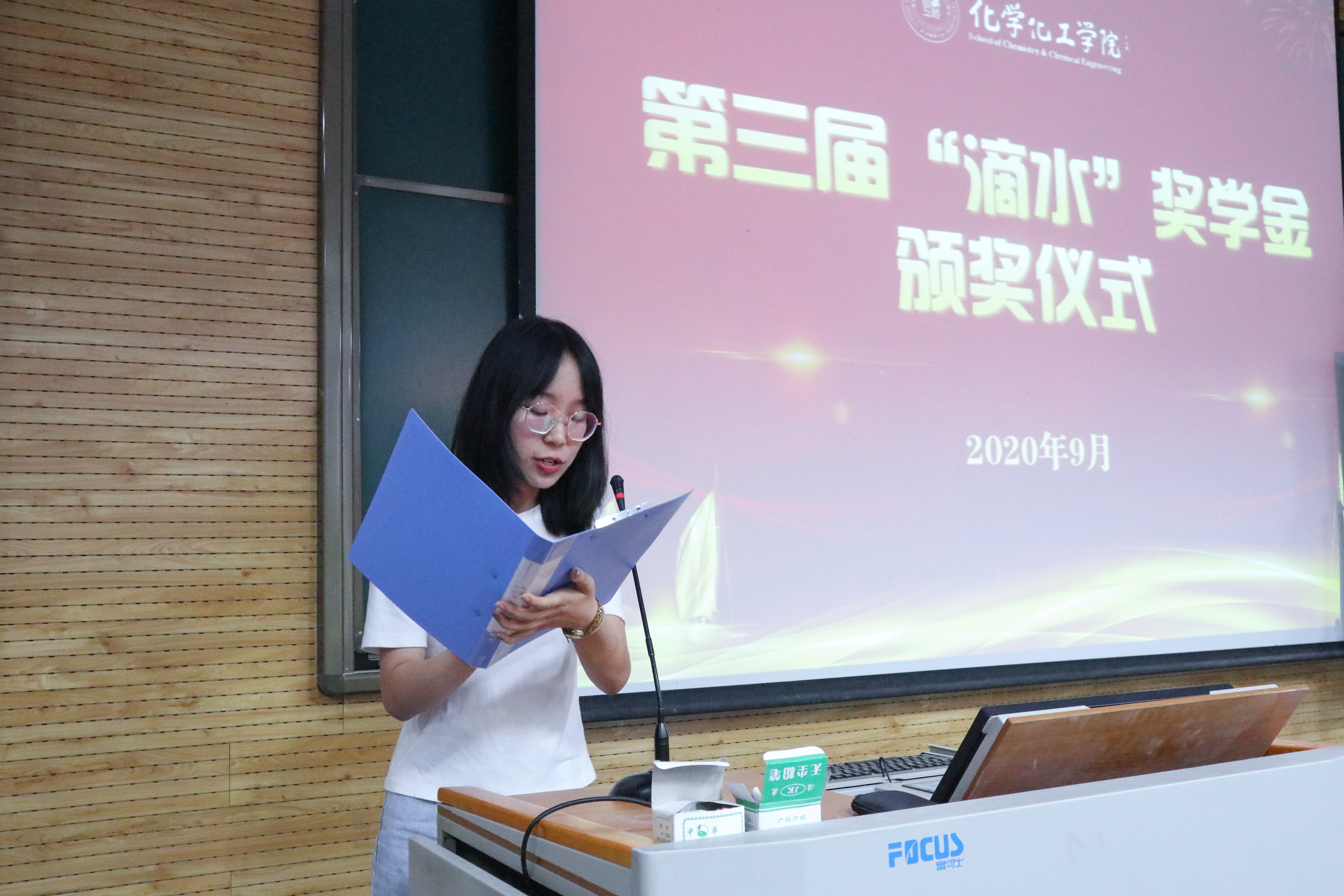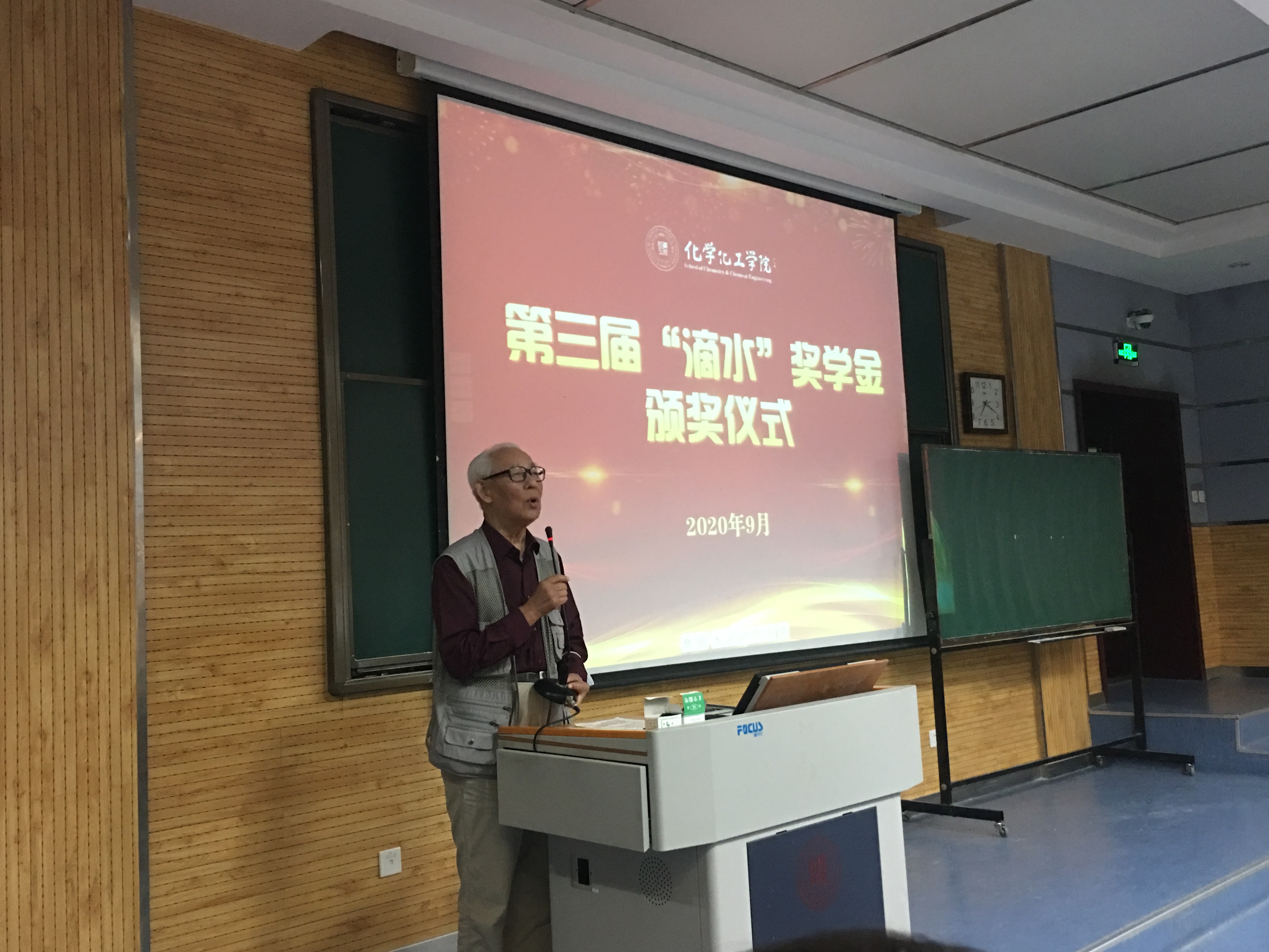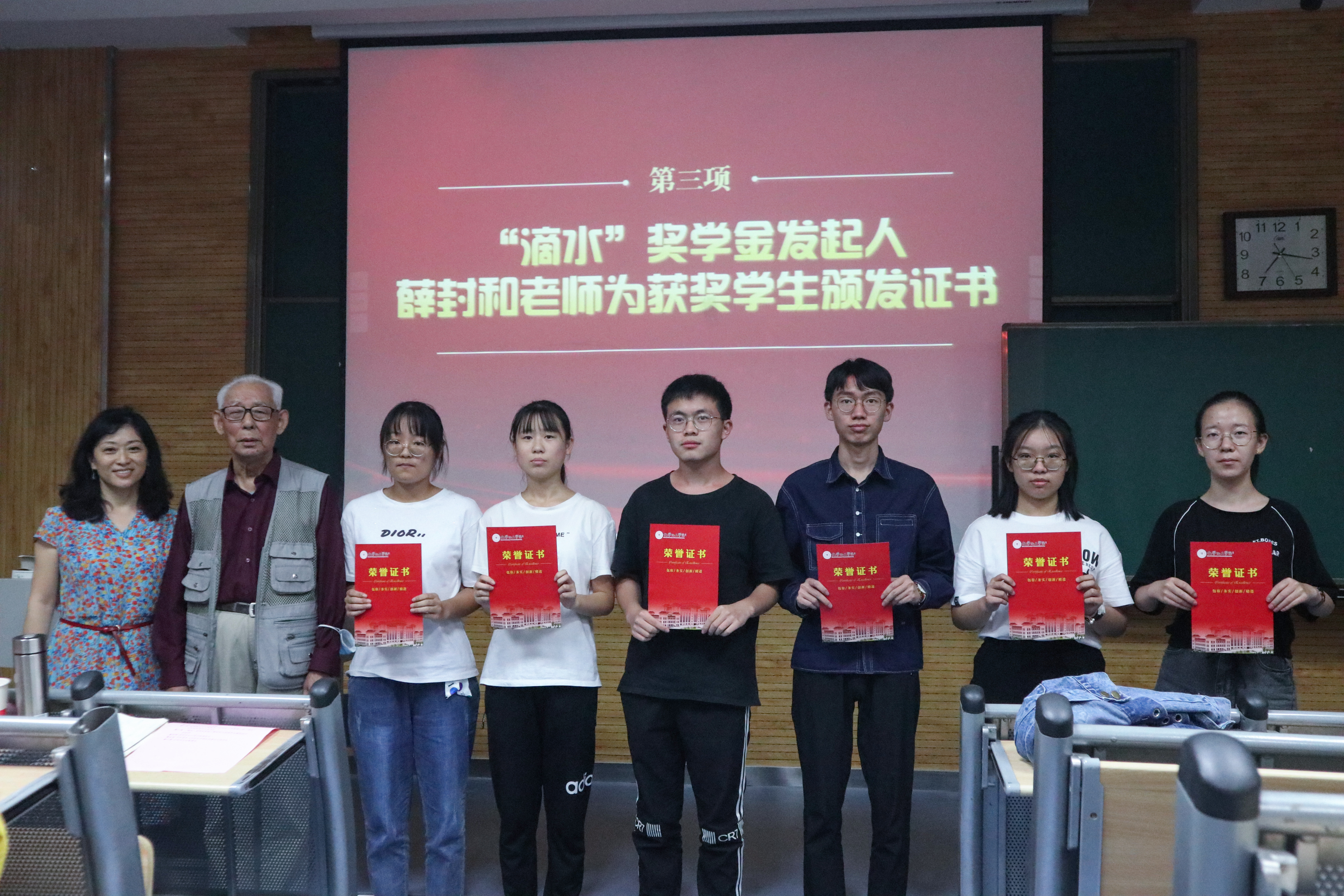 2020年9月13日晚,化学化工学院第三届 “滴水” 奖学金颁发仪式在雁塔校区5104教室举行。“滴水”奖学金是由学院退休教授薛封和老师捐资发起的,自2018年成立至今已有三个年头。薛封和老师、学院党委书记高玲香、分析化学教研室主任漆红兰、教工分析化学党支部书记刘伟、2019级辅导员邓文珺及2019级全体学生参加颁奖仪式。颁奖仪式由高玲香书记主持。