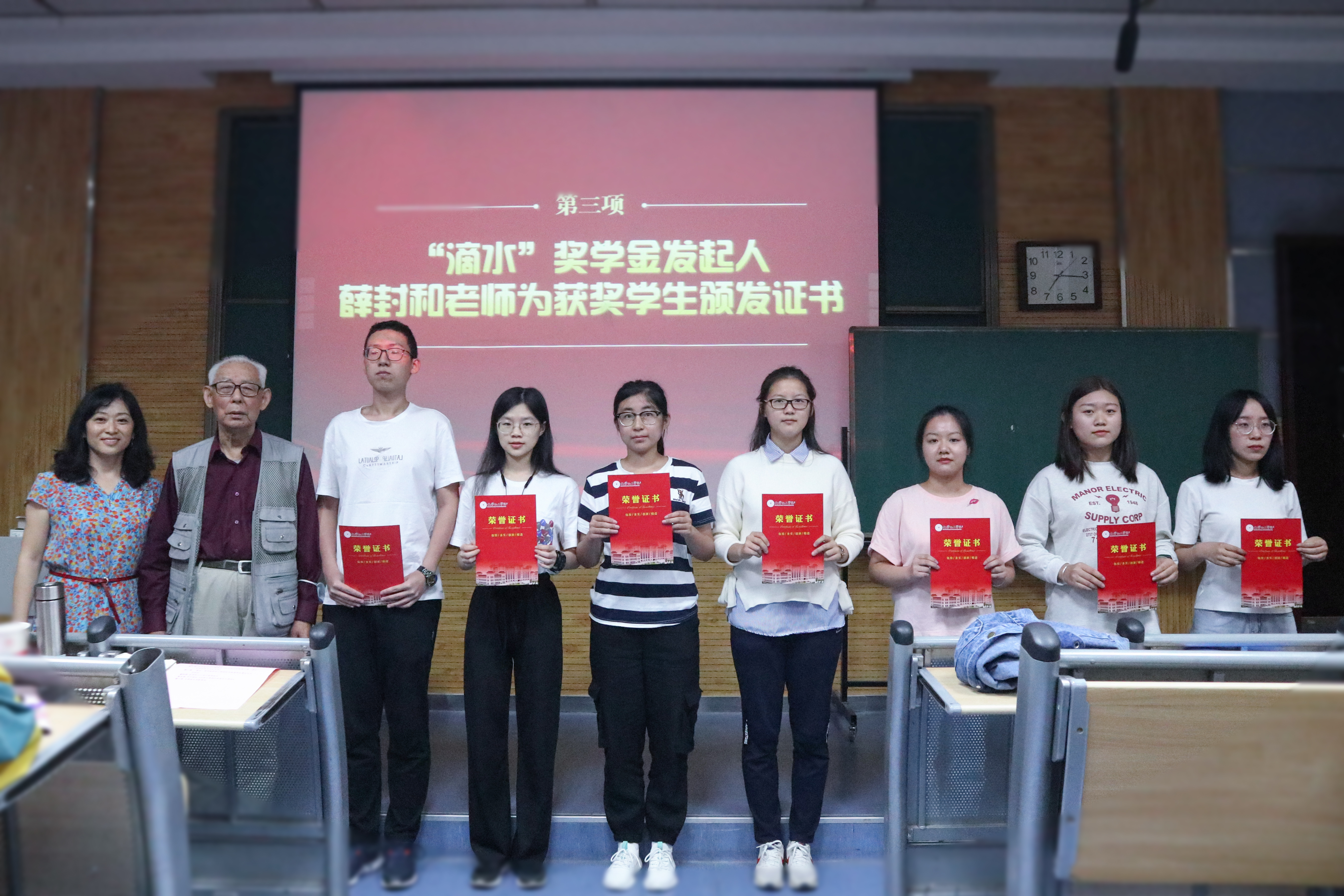 在热烈的氛围中,高玲香书记通过讲述学院发展历史与学科队伍建设历程,介绍了“滴水”奖学金的发起缘由与评选办法。薛封和老师为13名获奖学生颁发荣誉证书并讲话,他用亲切的话语分享个人亲身经历与多年教学心得,在黑板上郑重地写下了“感恩”二字,以此向同学们提出期许,一是要不忘历史、牢记党恩,尤其是在举国同心对抗疫情的战斗中感受中国制度优势,坚定爱国主义信念,勇敢肩负起时代发展和民族复兴的大任;二是要牢记身份、坚守传统,坚定文化自信,做中华优秀传统文化的忠实传承者和弘扬者;三是要不忘初心,锤炼本领,不断扎实学识与技能,让梦想在砥砺中前行。刘伟老师代表全体师生向薛封和老师献花,致以诚挚敬意和衷心感谢。