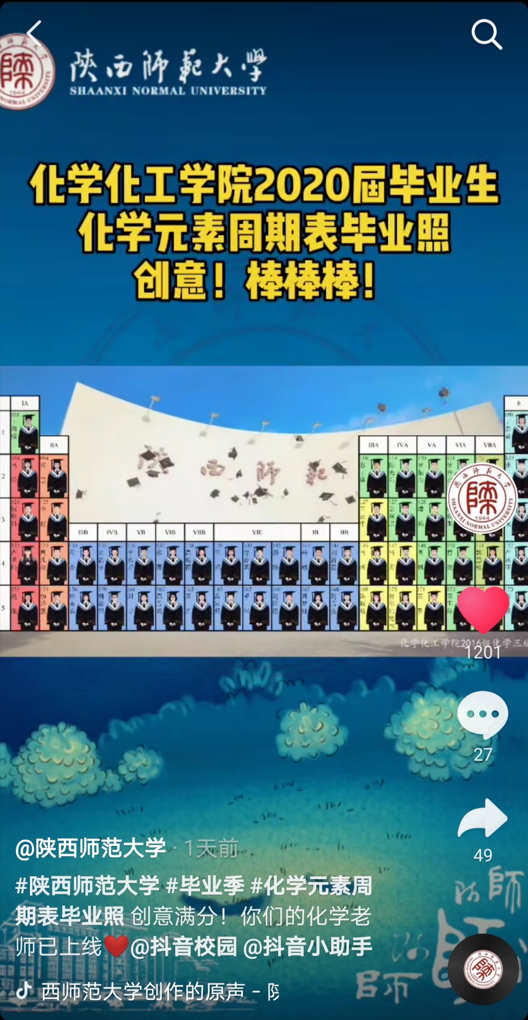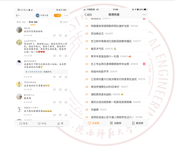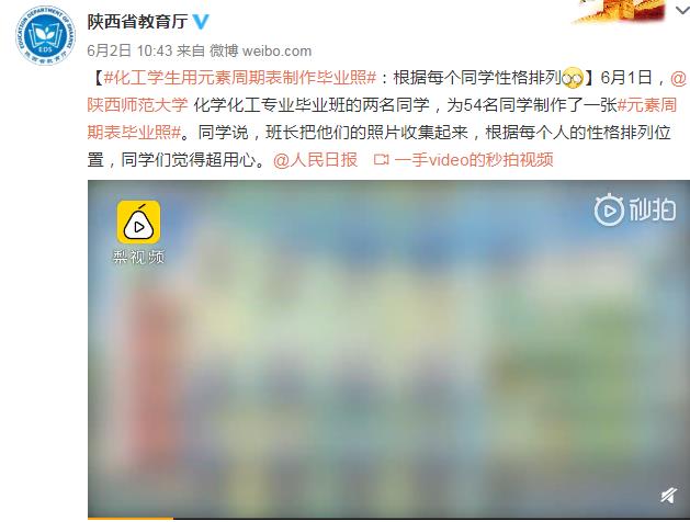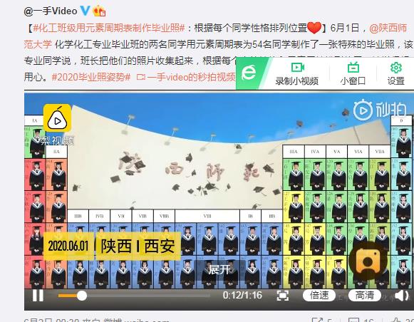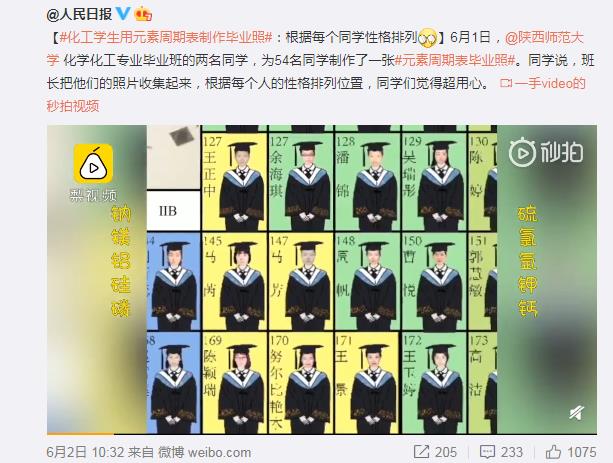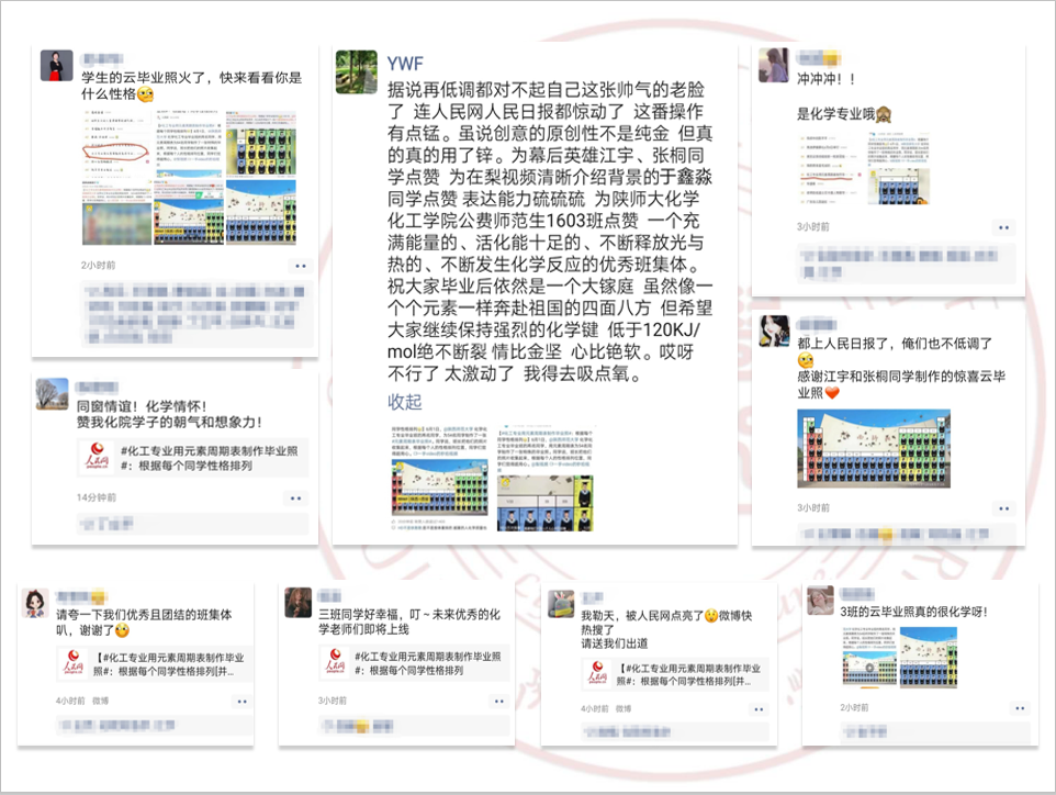 6月1日,我院2016级化学专业的江宇和张桐两位同学,根据化学元素周期表中元素的特性与每个人性格的契合度,为全班54名同学制作了一张特殊的云毕业照,极富创意的毕业照引发不少微博用户关注,迅速登上微博热搜榜。随后,陕西师范大学、人民网、陕西省教育厅、梨视频、抖音、腾讯等多个新媒体平台纷纷转载报道,在校内外引起热烈反响。