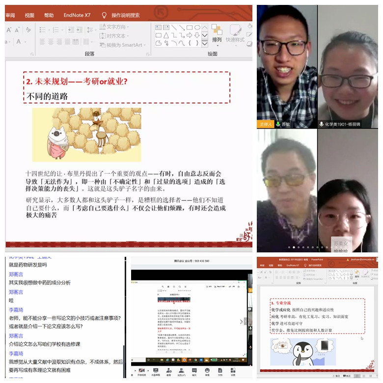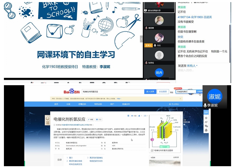 4月12日,化学1903班在线开展“教授接待日”活动,李淑妮教授受邀参加活动。李教授以“网课环境下的自主学习”为主题与同学们进行热切交流,她谈到,特殊时期的学习生活给同学们带来了新挑战,在做好防控工作的同时应学会自我管理,培养自主学习,精进专业技能,为创建优良学风共同努力。同时通过上传“网瘾自测量表”要求同学们认识到网络是把双刃剑,在合理利用的同时远离网瘾。同学们在展示近期学习成果的同时提出学习中的疑虑,李教授就论文写作与资料查找方面提供了注意要点和有效途径,同学们纷纷表示将活学活用,提高居家学习效率,实现更高的学习目标。