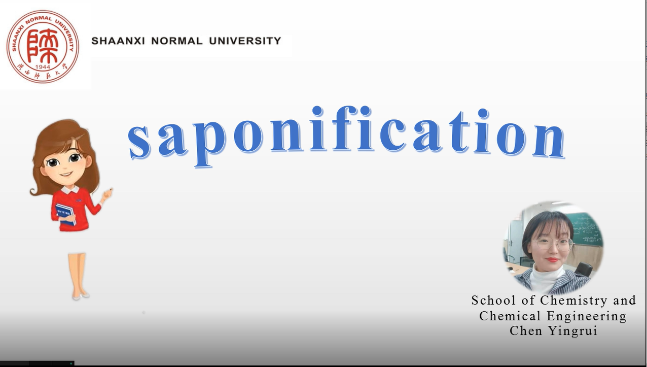 陈颖瑞同学制作的英文微课以《Saponification》为题,采用了贴近生活且难度适中的油脂的皂化反应为主题,以幽默、欢快的方式呈现知识,学生在了解皂化反应的同时,感受化学在实际生活中的重要存在,体验化学的魅力以及化学对生活的价值。