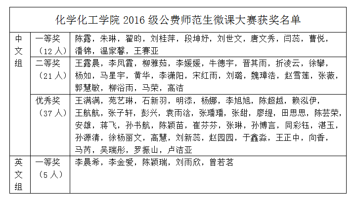 此次微课大赛对我院公费师范生的教学技能以及职前教师素养的提升起到了促进作用。其中,应用英语语言制作微课,使师范生们更好地了解国外化学基础教育改革发展的趋势和动态,积极参与国际化学教育交流,从而贯彻我校“以教师教育为主要特色”的办学宗旨,为致力于“卓越培养”计划,着力培养和打造合格、优秀的职前教师不断努力。