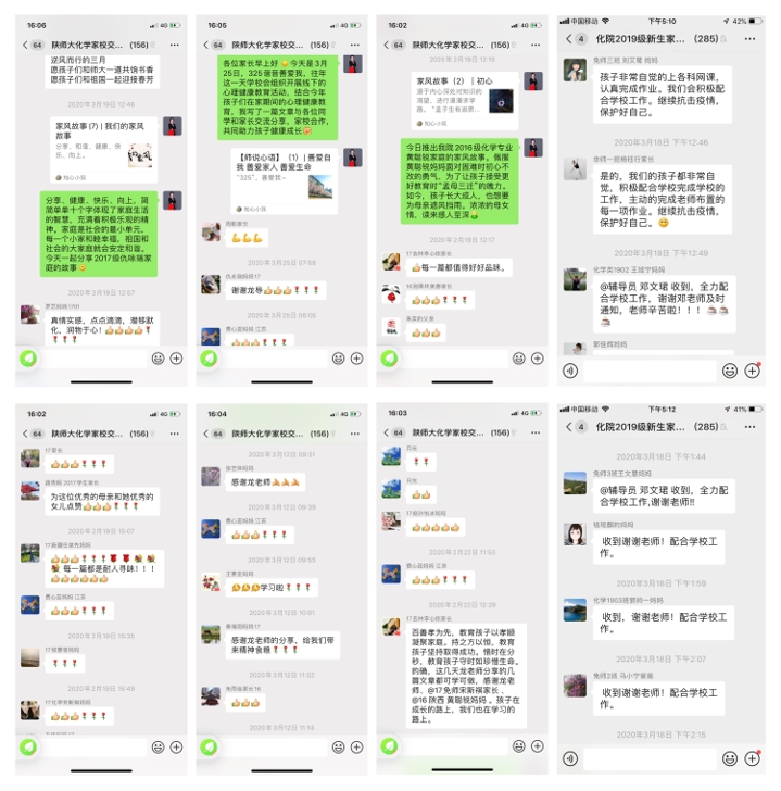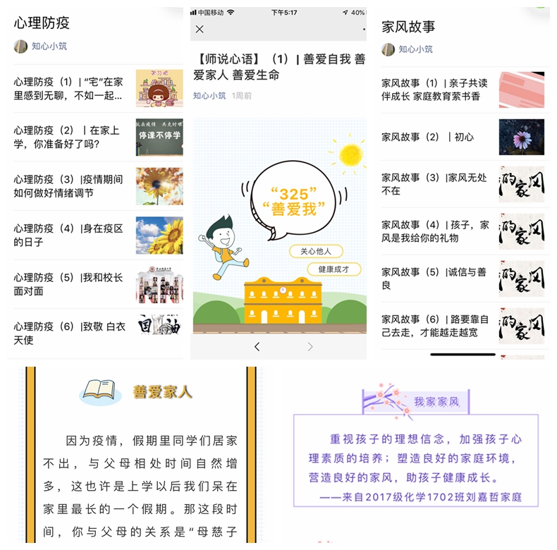 与家长心连心,为健康成长护航。为及时掌握学生在家上学期间的思想动态和心理变化,辅导员们创造性的利用在线方式开展家校合作。利用“知心小筑”微信平台开展系列活动,陆续推出“我们的家风故事”征文十五篇,引导家长营造良好家庭教育氛围;推出“心理防疫”主题文章十篇,引导学生积极提升自我情绪调节能力;撰写“善爱自我 善爱家人 善爱生命”专题文章,引导学生热爱生活,善爱家人,掌握与父母沟通交流的方法,积极改善亲子关系。同时,还通过向家长群里发布疫情防控相关的权威信息,引导学生与家长共同学习,做到科学防护、理性应对;定期开展线上家访活动,及时关注学生的情绪变化和学习状况;对于以往因心理问题受到重点关注的学生和疫情期间出现心理障碍的学生,更是与学生和家长密切联系,指导家长开展必要的心理疏导,为学生提供强大的亲情支持和心理关爱,并鼓励学生必要时主动求助,形成心理危机干预的家校联动机制,为学生健康成长保驾护航。