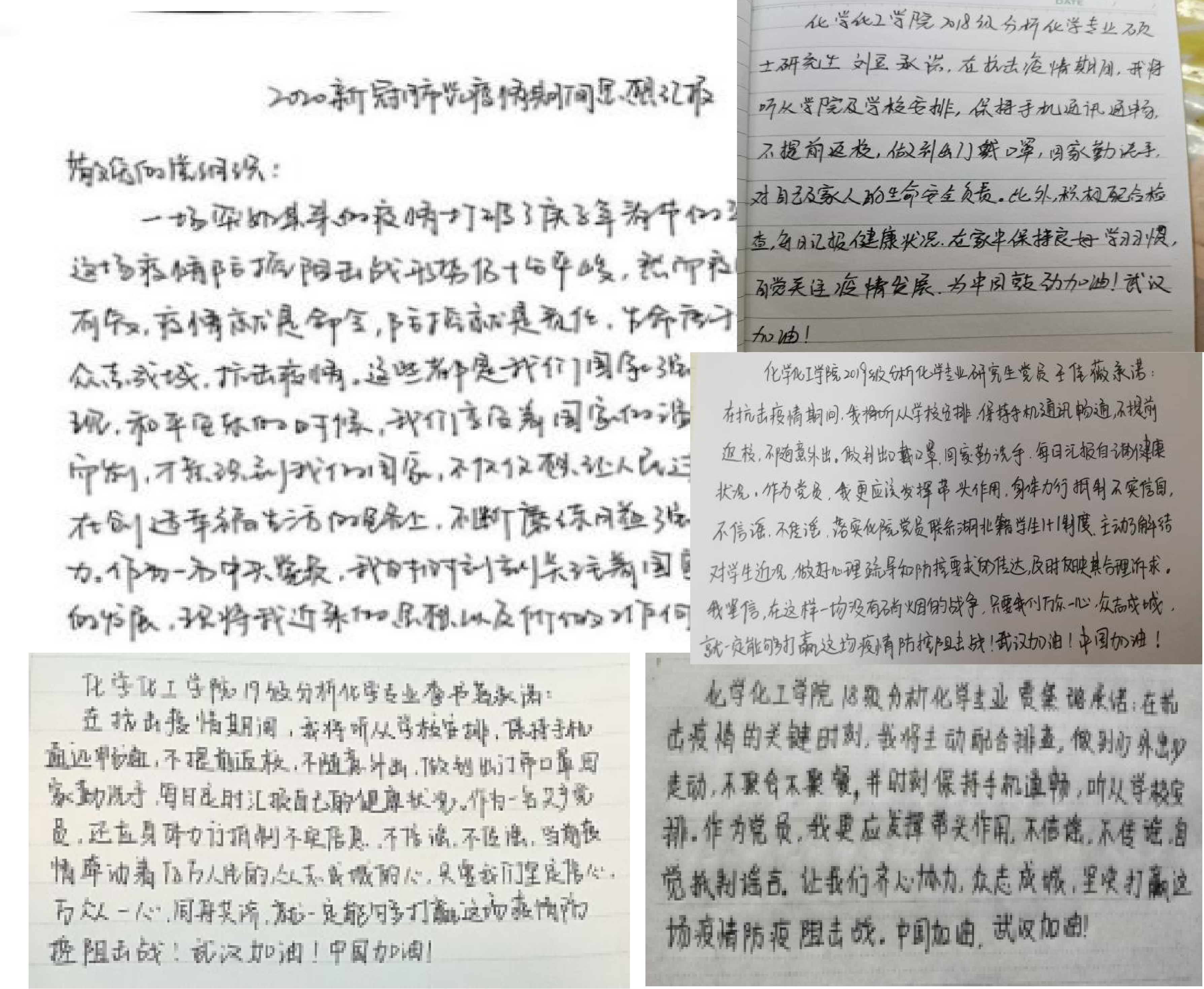 为坚决打赢疫情防控阻击战,在学校党委的统一领导和学院党委的统一指挥下,我院研究生党员们以实际行动践行初心、勇担使命。研究生党员们带头预防,率先垂范,以志愿者身份积极投身当地防控疫情的工作中,让党旗在防控疫情斗争第一线高高飘扬;积极地缴纳了特殊党费;结合疫情防控现状做出郑重承诺,用笔尖书写对社会的责任;用书法和漫画作品表达了为武汉加油,为中国加油;积极向党组织在线提交抗击新冠疫情思想汇报。
