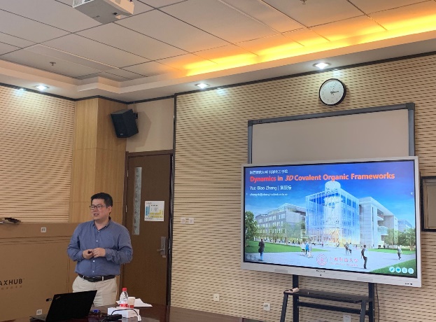 5月31日下午,上海科技大学章跃标教授应邀访问我院,并在致知楼1362报告厅为我院师生带来了“Dynamic 3D Covalent Organic Frameworks”的学术报告。我院白俊峰教授、翟全国教授、赵玉明教授、徐玲副教授、薛东旭副教授等教师以及我院相关专业研究生和本科生聆听了此次报告。报告会由薛东旭副教授主持。