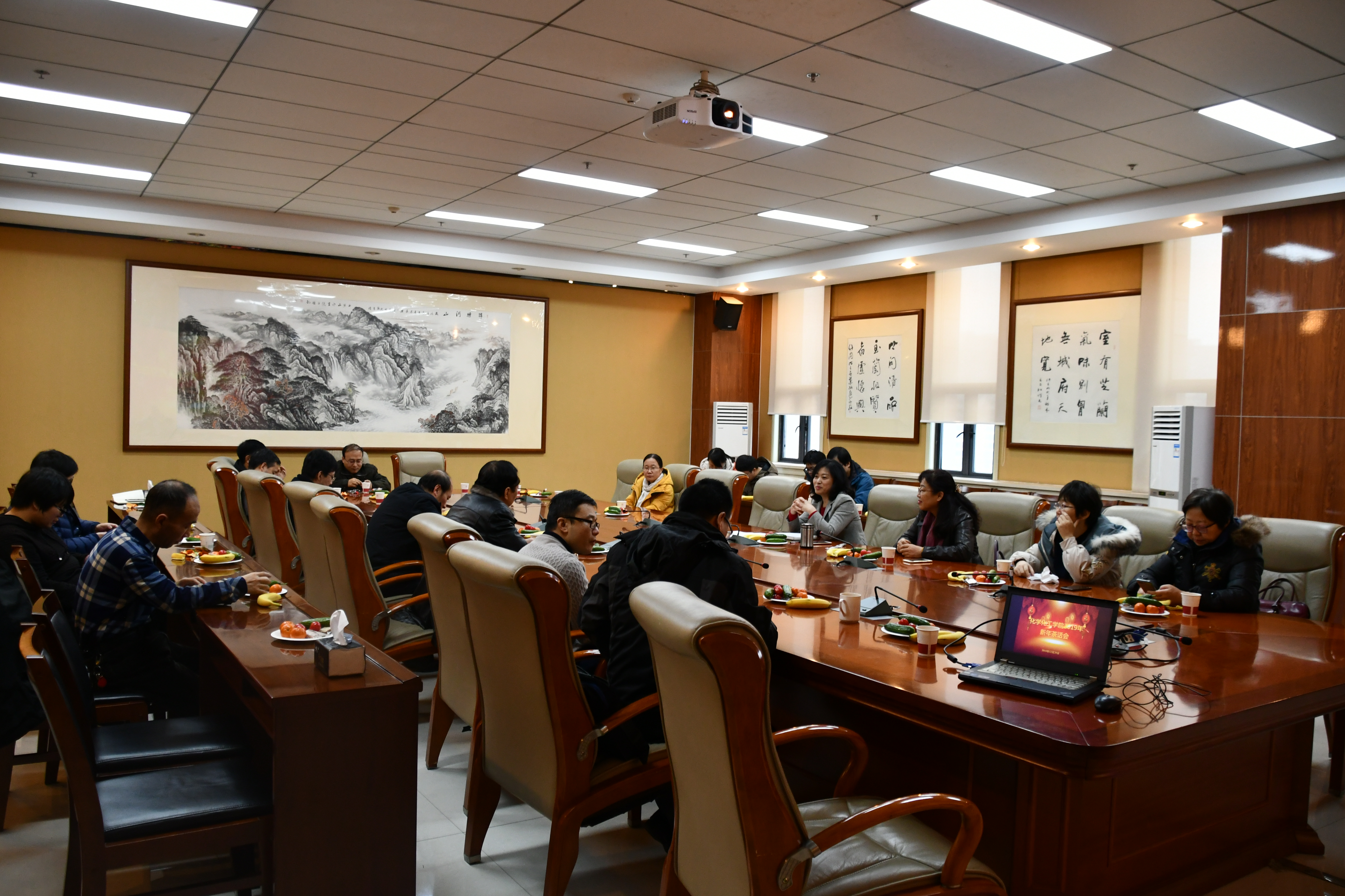 2018年12月29日上午,由学院党委和工会组织的化学化工学院新年茶话会在致知楼1568会议室举行。科技处副处长李保新,学院党委书记高玲香,党委副书记王晓,副院长丁立平、刘成辉、肖新军,工会主席张国防,实验中心主任杨文玉,教师代表陈亚芍、周青、董文生、刘峰毅、漆红兰、刘凯强、张伟强、刘静、赵玉明、张伟、彭浩南等参加了此次茶话会。高玲香主持会议。