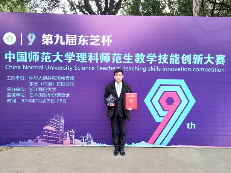 2018年12月25日-28日,第九届“东芝杯•中国师范大学理科师范生教学技能创新大赛”总决赛在浙江师范大学举行。经过教学设计、即席演讲、模拟授课和现场提问等4个环节的激烈角逐,代表我校参加此项赛事的化学化工学院2015级化学卓越班胡旭亮同学获得了三等奖的好成绩。