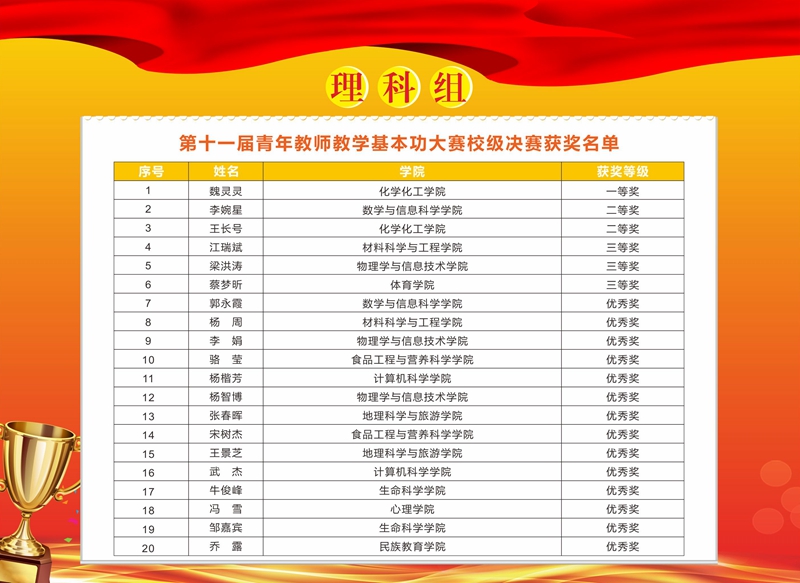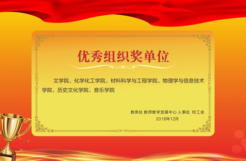 决赛评审由教学设计、课堂教学展示和粉笔字书写评审三部分构成,专家评委主要由校内外各级教学名师、教学专家担任。经过激烈角逐,我院魏灵灵和王长号两位老师分别获得理科组一等奖和二等奖,刘小燕老师在全英语组中获得优秀奖,我院被评为优秀组织单位。此次大赛获奖,我院实现一等奖零突破,三位参赛青年教师充分展现了扎实的教学基本功,丰富的专业知识和别具一格的课堂教学风格。