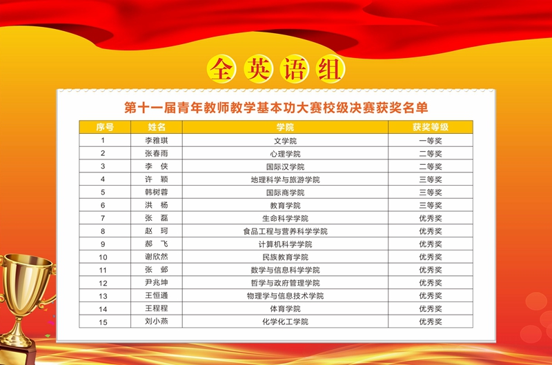 由教务处、教师教学发展中心、人事处和校工会联合主办,第十一届青年教师教学基本功大赛校级决赛于2018年12月15日-17日成功举办。本届大赛全校共有410名青年教师参加了学院预赛,各学院按照限额向学校推荐校级决赛参赛教师56名。我院王长号、魏灵灵和刘小燕三位老师参加决赛。