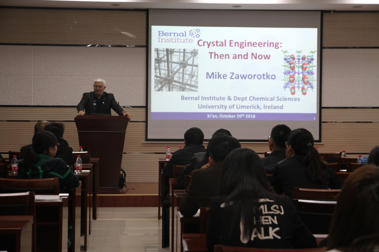 2018年10月20日下午,爱尔兰利莫瑞克大学Mike Zaworotko教授应邀访问我院进行学术交流,并在致知楼1668报告厅为我院师生带来了题目为“Crystal Engineering: Then and Now”的报告。西安交通大学杨庆远教授、西北工业大学陈凯杰教授,我院白俊峰教授、焦桓教授、张伟强副教授、薛东旭副教授、王倩博士以及我院相关专业研究生和本科生聆听了此次报告。报告会由白俊峰教授主持。