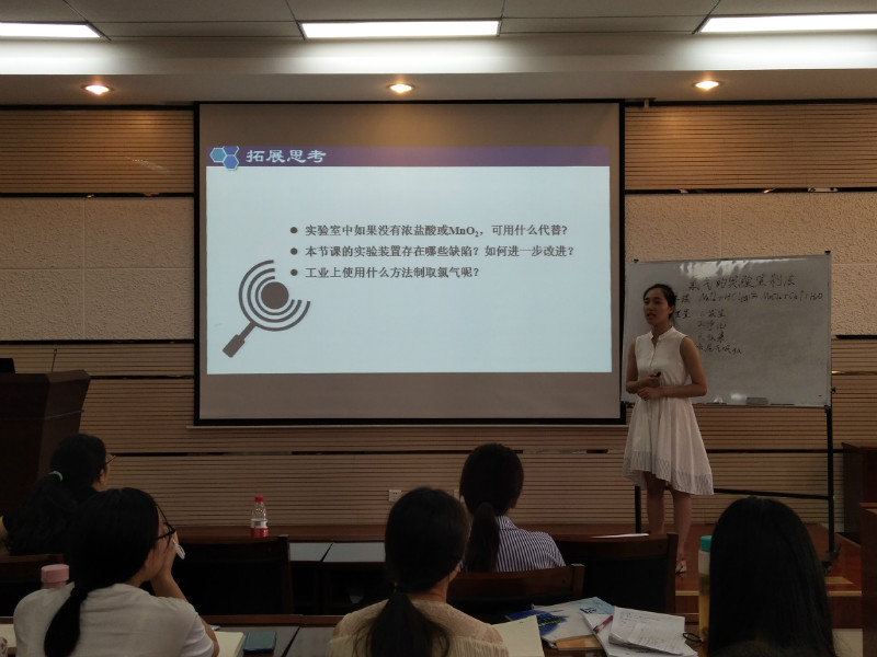 15日下午,培训会在薛亮副教授的主持下顺利进行。交大附中高级教师简少国老师进行了《盐类的水解》的示范课。他以引导学生利用pH试纸测定溶液pH值来确定溶液酸碱性的方式导课,激发了学生课堂参与兴趣。简老师将课堂的主动权交给学生,让学生亲自动手实验,锻炼了学生的实验操作能力。同时,他以清晰的逻辑将较有难度的盐类水解问题简单化,让同学们对本节课内容有了新的认识。然后,卓越班五位同学进行了试讲,简老师、杨承印、薛亮、严文法老师分别针对学生特点,对同学们做出了全面细致的点评,并为他们提出了中肯的建议与恰当的引导,同学们深受启发。