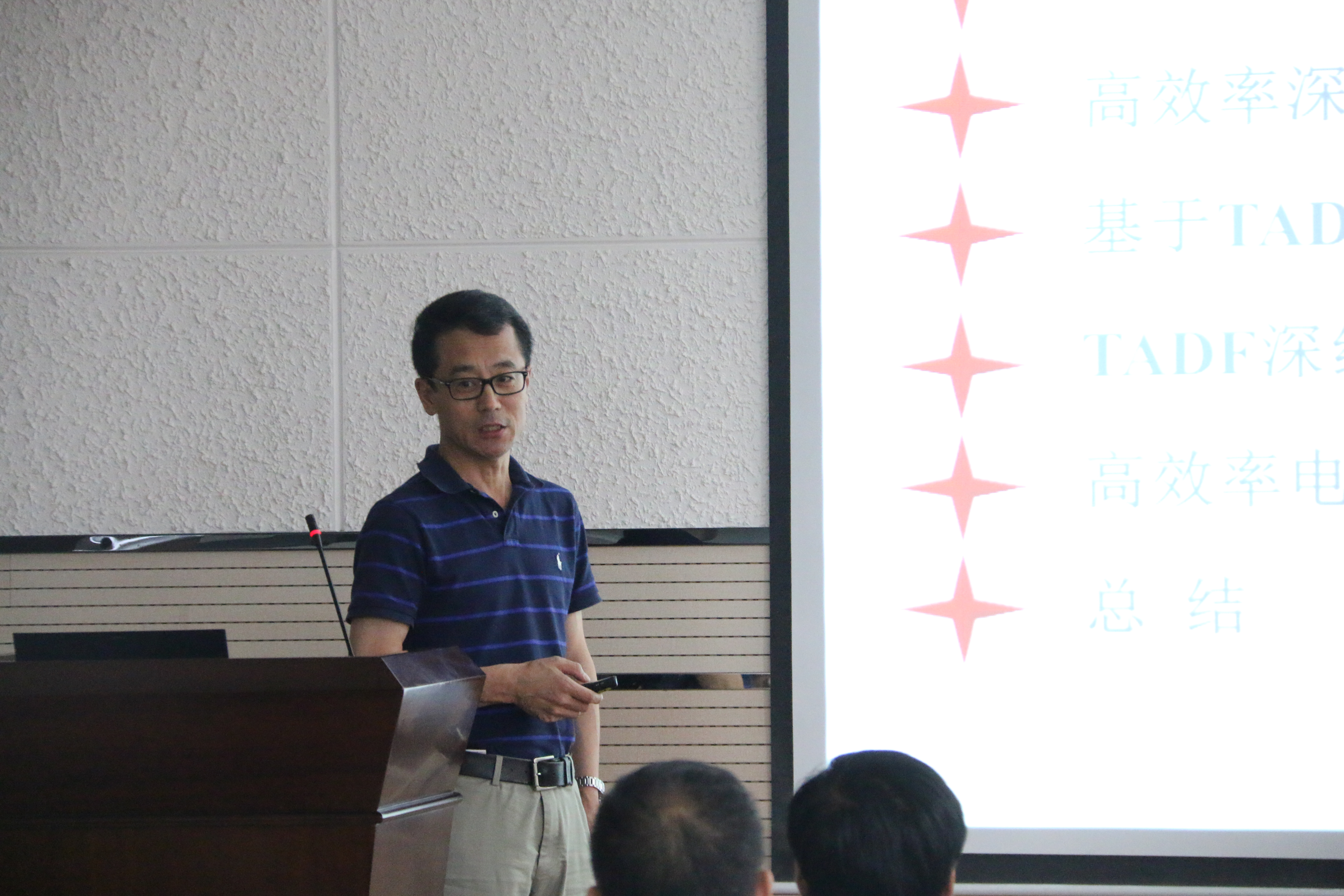 吴立新教授重点介绍了具有刚性无机核(多金属氧簇阴离子)与柔性有机壳(含有烷基链的表面活性剂阳离子)通过离子相互作用获得超分子复合物并将其发展成为一类具有独特结构和自适应性质的新的构筑基元体系,系统的研究了各种条件下的组装原理与组装过程。王悦教授的报告内容主要包括三大部分:(1)高效率深蓝色电致荧光材料;(2)高效率深红及近红外热活化延迟荧光材料;(3)新型高效率电致磷光材料。并针对有机电致发光材料与器件研究领域存在的一些问题,提出了一些设计合成有机电致发光材料的新思路;同时汇报了课题组在高效率电致荧光和磷光材料方面取得的一些研究进展。报告结束后参会的老师和学生踊跃提问,就感兴趣的问题与两位老师进行了深入探讨。
