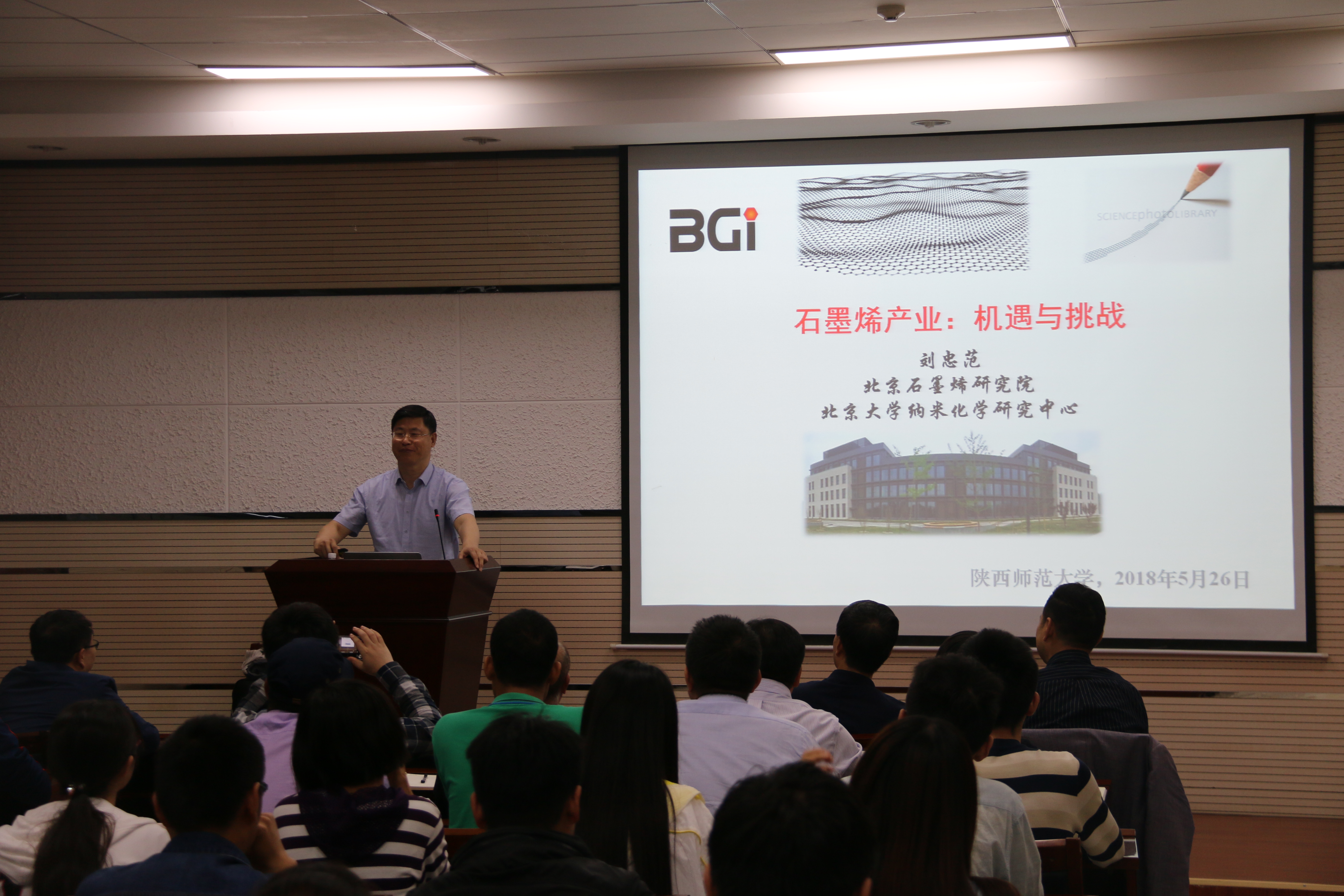 5月26日,中国科学院院士,北京大学刘忠范教授应邀来我院进行学术交流,并在致知楼1668会议室为学院师生作了题为“石墨烯产业:机遇与挑战”的学术报告。材料科学与工程学院刘宗怀教授、刘生忠教授、徐华副教授,化学化工学院房喻教授、薛东教授、白俊峰教授、李保新教授、李宝林教授、白云山副教授、刘静副教授、彭军霞副教授 、彭浩南博士、党静霜博士等百余名师生参加了此次报告会。报告会由房喻教授主持。