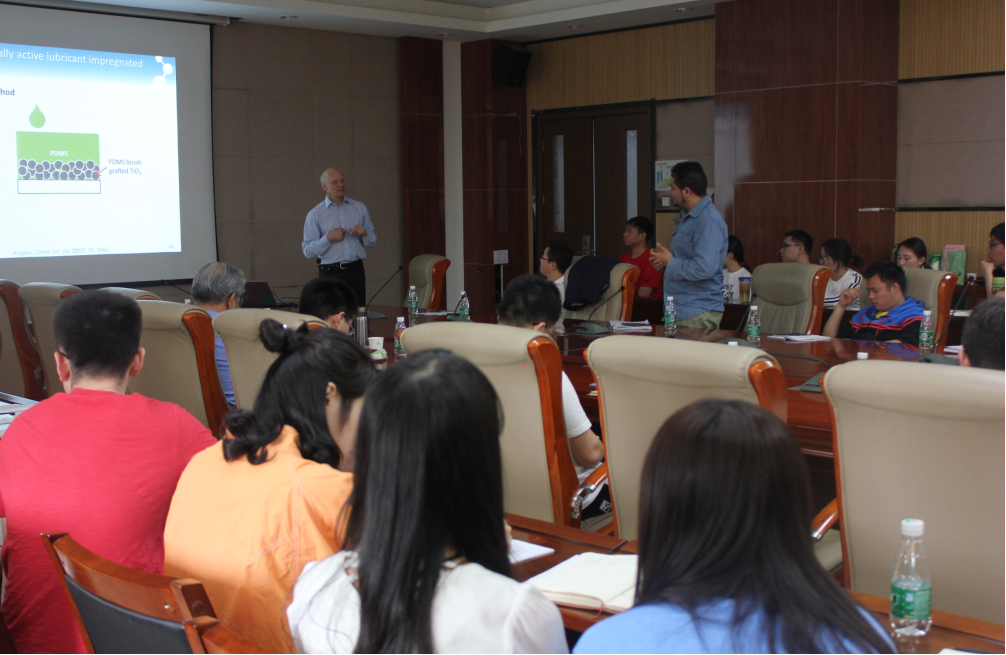 报告后,老师和同学们结合自己的研究积极向 Hans-Jürgen Butt教授提问并展开讨论。会议在一片热烈的气氛中圆满结束。