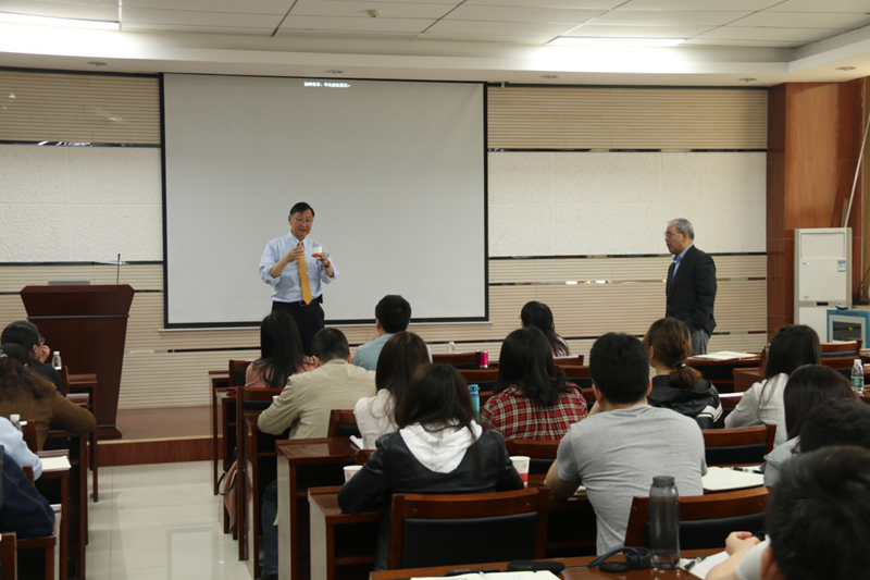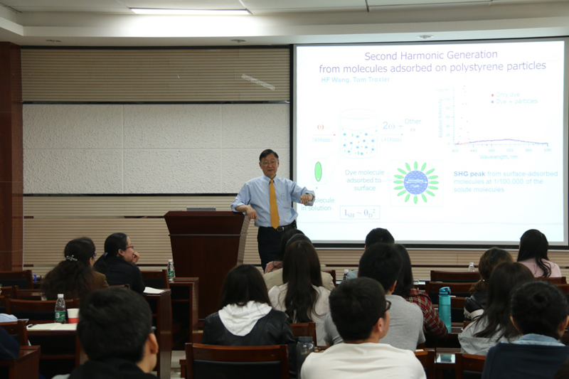 4月18日上午,美国天普大学副校长戴海龙教授应邀访问我院,并在致知楼1668报告厅为我院师生带来题为“Second Harmonic Light Scattering from Colloidal Objects”的精彩报告。报告由房喻教授主持,学院陈亚芍、丁立平、张颖、杨鹏、边红涛、刘静,刘太宏、彭军霞、彭浩南、王红艳等老师以及和相关专业博士生、硕士生和本科生聆听了本次报告。