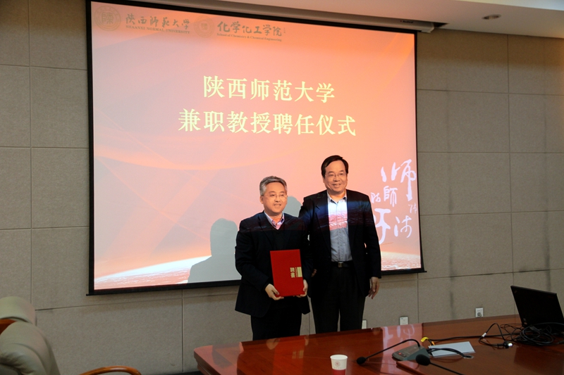 会议第二项是王宁波兼职教授聘任仪式。刘忠文教授简要介绍了王宁波教授的主要研究方向和学术成就。党怀兴副校长代表学校为兼职教授颁发了聘书。王宁波教授表达了对陕西师范大学和化学化工学院的感谢,并表示将尽己所能在科研创新平台建设、产学研用协同攻关、校企联合人才培养等方面为陕西师范大学应用化学专业建设和发展贡献力量。