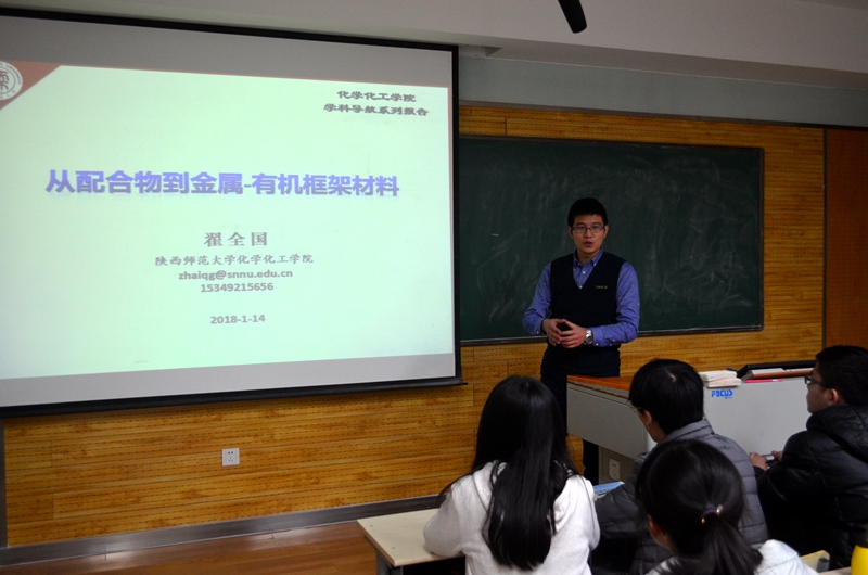 1月14日晚,我院“学科导航-化学与化学发展”报告会在雁塔校区5108教室举行,翟全国教授做了“从配合物到金属——有机框架材料”的主题报告。报告会由2017级辅导员龙卓华老师主持,我院2016级、2017级本科生和其他专业学生代表共计100余人到场聆听了报告。
