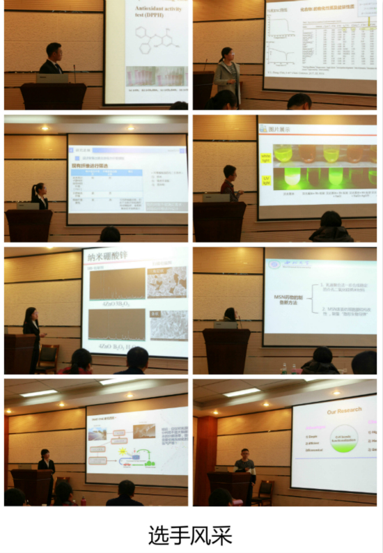 开幕式后,来自我院2015级笃学班的4组本科生科研团队和西北大学化学与材料科学学院的4组本科生科研团队进行交流。8组选手依次展开报告:来自我院的牛子儒同学(团队成员王丹、李茜、高进和刘睿琪),采用英文PPT向大家介绍了他的项目—基于环糊精构筑超分子自组装水凝胶;田思玉同学为大家介绍了牺牲模板法制备超快充全固态线性超级电容器;史雪敏同学(团队成员有王照娟、王希妍和任星)的项目是原位复合SiO2-硼酸锌纳米材料的制备、表征及阻燃性能研究;林思敏同学介绍了Au/MoS2/TiO2核-壳结构复合材料的制备及其在光催化水分解产氢中的应用。来自西北大学的张雨彤同学(团队成员有田亚茹和安尚洁),介绍了三唑类高能有机金属框架(HE-MOFS)的合成、结构及理化性质的研究;彭嘉鑫同学(团队成员有田亚茹和安尚洁)介绍了有机金属笼状化合物的主客体化学研究;党倩同学(团队成员贾岚欣)介绍了介孔二氧化硅纳米药物的制备新方法研究;任江涛同学(团队成员谢虎)介绍了Regioselective C-H Bond Functionalization。每一个团队汇报人不仅介绍了项目研究背景、主要创新点及研究内容,还分享了参与科研的收获和感悟,并与老师进行了现场的交流和探讨。
