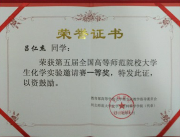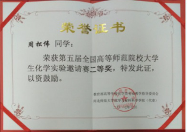 2017年7月15-18日,由教育部高等学校化学类专业教学指导委员会(高师协作组)主办,河北师范大学承办的第五届全国高等师范院校大学生化学实验邀请赛在河北石家庄举行。本次大赛有北京师范大学、华中师范大学、华东师范大学、东北师范大学、陕西师范大学等38所师范院校,113名学生参赛。本次大赛分为笔试和实验操作两部分,最终我院吕仁杰同学凭借扎实的理论基础和标准的实验操作荣获一等奖,周松伟、丁海玲同学荣获二等奖。