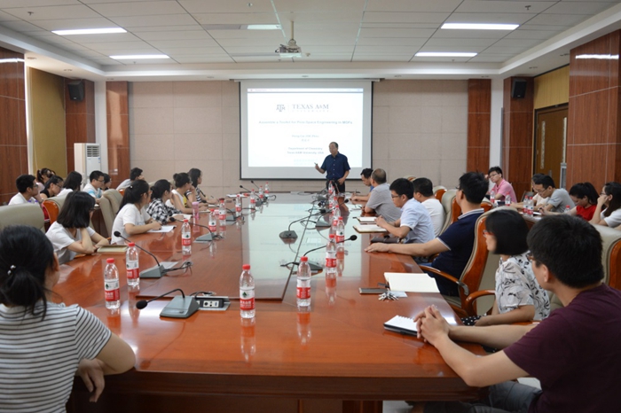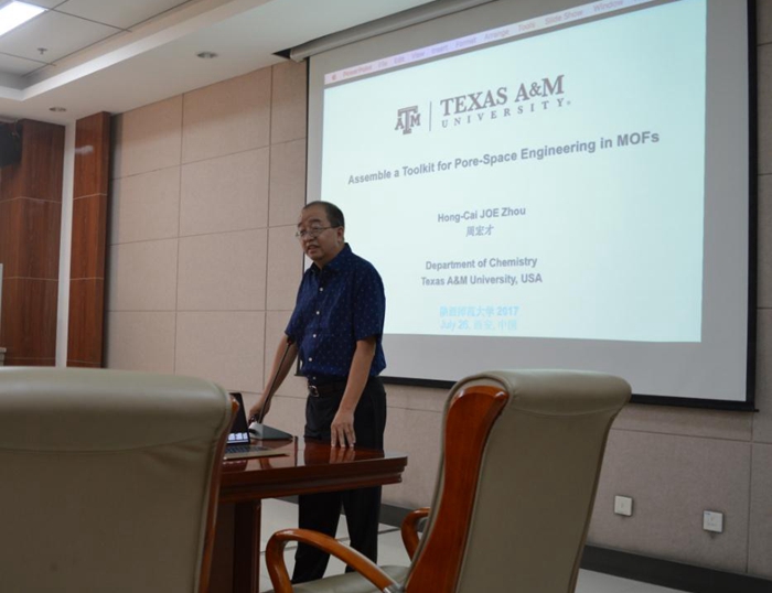 2017年7月26日上午,美国德克萨斯A&M大学周宏才教授受邀前来我院,在致知楼1568报告厅为我院师生作了题为“Assemble a Toolkit for Pore-Space Engineering in MOFs”的精彩报告。报告会由白俊峰教授主持,我院焦桓教授、翟全国教授、薛东旭副教授、简亚军副教授、顾泉副教授、王长号副教授、王艳艳博士等教师及相关专业研究生、本科生聆听了报告。