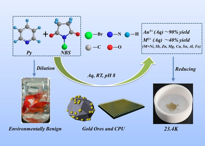 在以上工作基础之上,杨鹏课题组于2014年开始尝试使用此类原创性化学方法来实现对低品味金矿和电子垃圾中Au的高效回收,期待为解决关乎国计民生的重大问题而提供一些有益思路。近日,杨鹏课题组在国际顶尖化学类期刊《德国应用化学》上报道了最新研究成果(Angew. Chem. Int. Ed. 2017, DOI: 10.1002/anie.201703412),并被遴选为Hot Paper。在此工作中,为降低成本从而真正实现大规模应用,他们直接使用NBS和吡啶(Py)的室温中性水溶液对低品味金矿和电子垃圾中的Au进行高效提取,发现该体系可以取代传统的剧毒氰化物和高浓度强酸体系而取得更加高的提取效率,成本却低很多,细胞和生物毒性也极大降低,从而有望解决目前从低品味金矿和电子垃圾中提取Au所面临的巨大的环境污染和高能耗问题,为采矿工业和处理电子废料提供了一种新策略,为可持续发展循环经济提供了现实的参考和指导。该论文第一作者为杨鹏教授指导的硕士研究生乐春林。该工作还得到了西北工业大学生命学院邓旭东老师和天津医科大学张旭老师的特别支持,他们也是本工作的合作者。陕西师范大学化学化工学院,应用表面与胶体化学教育部重点实验室为该工作的第一单位及唯一通讯作者单位。