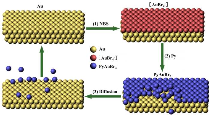 针对这一挑战,陕西师范大学“光子鼻与分子材料”创新团队杨鹏教授于2012年发现一类新的Au氧化反应,即DNA中碱基的类吡啶结构可以与三价Au离子形成有效配合物,从而降低Au的氧化能垒,实现在室温中性温和水溶液中的高效Au氧化和刻蚀(需加入少量弱氧化剂NBS, N-溴代丁二酰亚胺引发氧化反应),相关成果发表在Chem. Commun.上(Chem. Commun. 2012, 48, 8787)。基于此成果,在国家自然科学基金委的支持下(nos. 21374057, 51303100, 51673112),杨鹏课题组于2014年进一步阐明其刻蚀机理,发现其本质就是NBS和类吡啶结构(如生物大分子DNA或者小分子吡啶试剂)对Au的协同氧化刻蚀机制(Langmuir 2015, 31, 2922)。