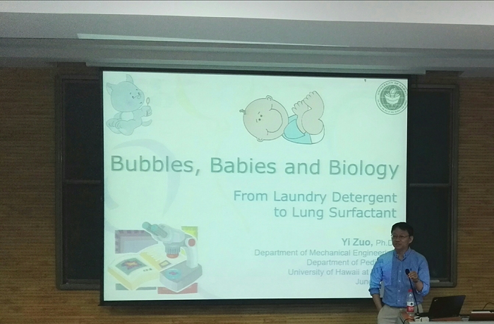 2017年6月19日晚,应陕西师范大学化学化工学院邀请,夏威夷大学机械工程系左燚教授在雁塔校区5101教室为2015级本科生做了题为“Bubbles, Babies and Biology – from Laundry Detergent to Lung Surfactant”的学术讲座。本场报告由化学化工学院陈亚芍教授主持。