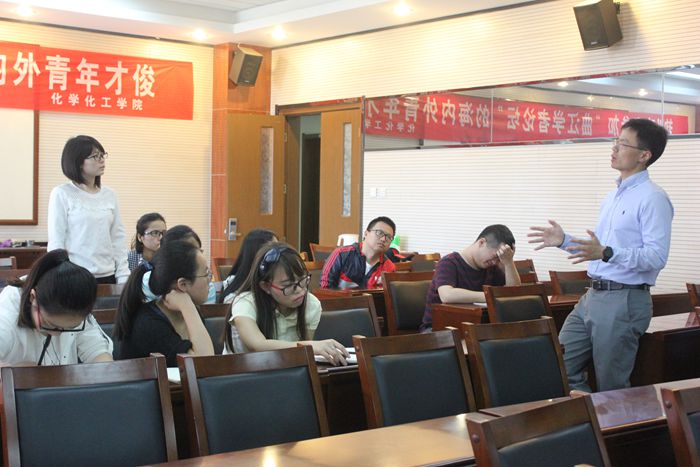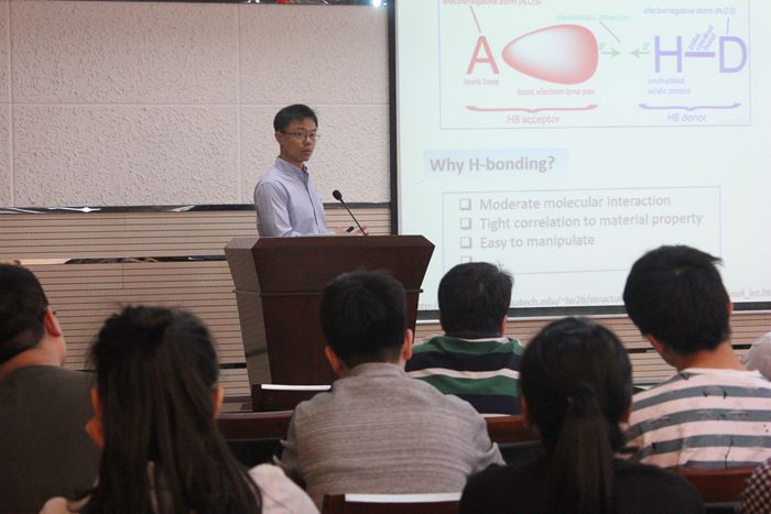 朱家华助理教授主要介绍了将生物高分子引入功能材料后为材料带来的新的可能性以及新的应用,如热传导应用、绿色润滑剂、水净化以及催化等。生物高分子是地球上丰富的原料之一,它们(如纤维素、木质素、半纤维素)不仅可以被加工为增值的化学产品(如生物燃料),更重要的是,由于生物分子具有的独特结构和自主装模式,这为设计多种多样的功能材料提供了很好的平台。最后,朱家华介绍了美国阿克隆大学的相关信息,使同学们对国外研究平台有了更多的了解,激发了与会学生浓厚的兴趣。