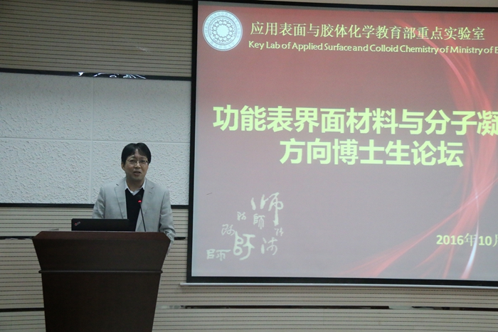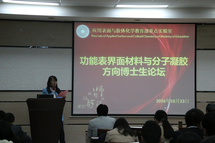 2016年10月23日下午,由应用表面与胶体化学教育部重点实验室主办的“功能表界面材料与分子凝胶方向博士生论坛”在致知楼六层报告厅顺利举行。化学化工学院房喻教授、董文生教授、焦桓教授、丁立平教授、陈亚芍教授、刘守信教授、张颖教授、雷忠利教授、张国防教授、杨鹏教授、刘静副教授、彭军霞副教授,刘凯强副教授等教师以及相关专业研究生参加了此次论坛。