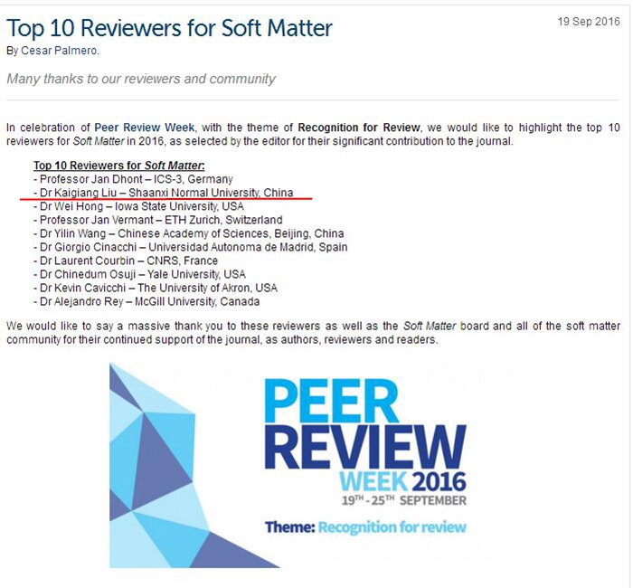9 月 19-25 日是 2016 年度全球 Peer Review Week 周,今年的主题是 “Recognition for Review”,旨在表彰为期刊出版、基金评审、会议申请等一系列工作作出重大贡献的评审人员。本届 Peer Review Week 期间,英国皇家化学会评选出了旗下 43 本期刊每本期刊的十佳评审人。我院刘凯强博士荣获《Soft Matter》期刊十佳审稿人。