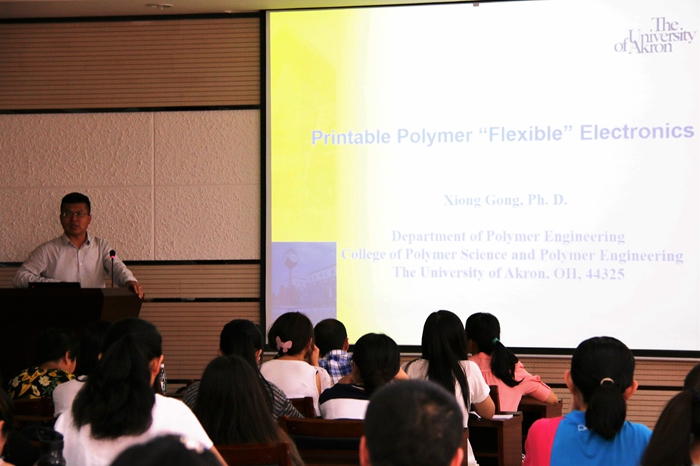 2016年7月1日下午两点半,美国阿克伦大学高分子科学和高分子工程学院的巩雄教授受邀在致知楼1668报告厅为我院师生作了两场精彩报告,分别为“Printable flexible electronics”和“Solution-Processed Solar Cells via Novel Materials and Device Engineering”。报告会由彭军霞副教授主持,我院的房喻教授、蔡雪刁副教授、刘凯强副研究员等老师和相关专业的研究生及本科生聆听了此次报告。