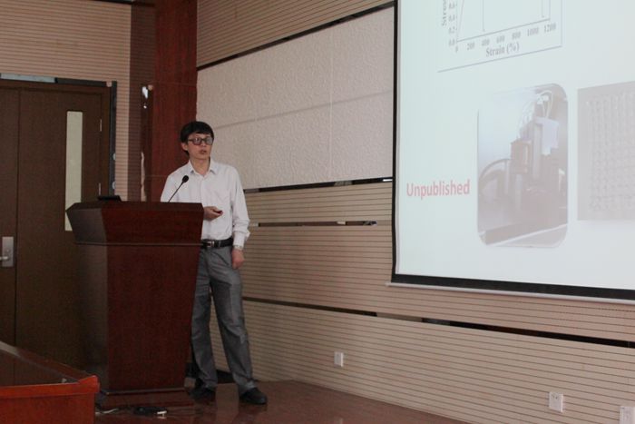 2016年5月30日,天津大学刘文广教授受邀在我院致知楼1668报告厅为我院师生作了一场题为“基于侧链多重氢键构建高强度热塑性超分子聚合物水凝胶”的精彩报告,报告会由杨鹏教授主持,西安交通大学杨建海教授,我院江金强教授、边红涛教授、蔡雪刁副教授、刘凯强副教授等教师及相关专业研究生聆听了报告。