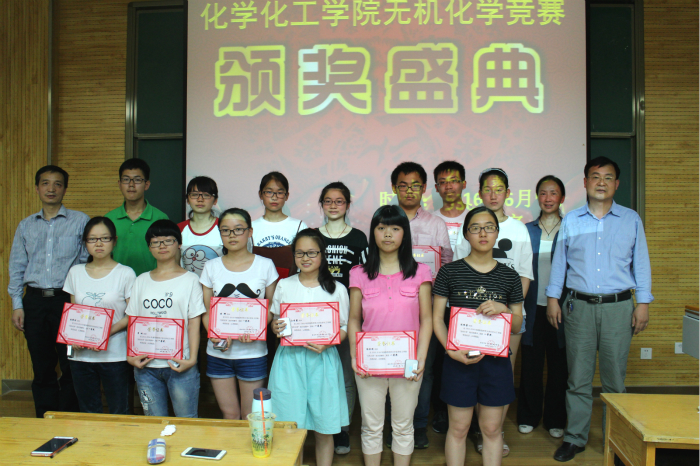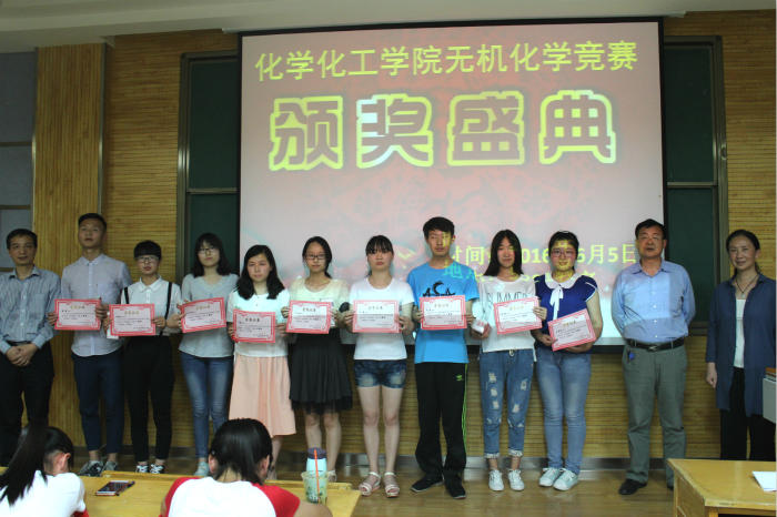 2016年6月5日晚七点,化学化工学院在雁塔校区5301教室举办了无机化学竞赛颁奖活动。化学化工学院李保新副院长、刘志宏教授、蒋育澄教授、2015级化学类辅导员龙卓华及一百多名获奖学生参加。
