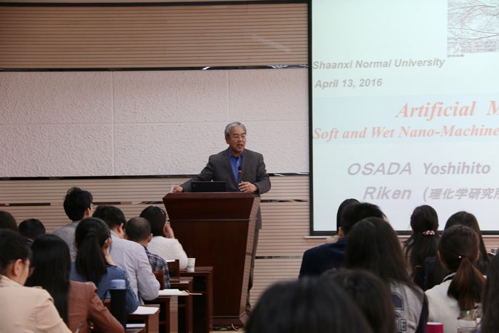 2016年4月13日上午,受应用表面与胶体化学教育部重点实验室和“应用表面与胶体化学”引智基地邀请,日本Hokkaido University大学前副校长和日本RIKEN Advanced Science Institute的高级顾问Osada Yoshihito教授在致知楼1668报告厅为我院师生作了题为 “Artificial Muscles - Soft & Wet Nano-machine of the Next Era” 的精彩报告。报告由房喻教授主持,我院徐峰教授、杨鹏教授,丁立平教授,彭军霞副教授,刘静副教授,彭浩南老师,刘凯强老师等相关老师及相关专业的研究生和本科生近100人聆听了报告,西安交通大学航空航天学院、机械结构强度与振动国家重点实验室、柔性材料国际研究中心的陈咏梅教授(博导)陪同Osada教授参加了此次报告会。