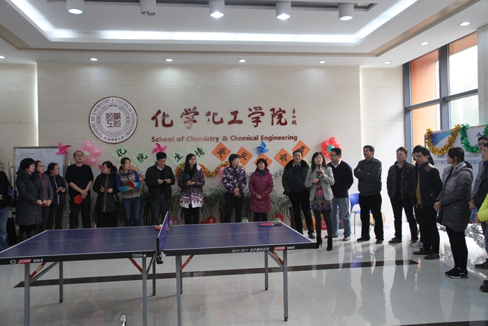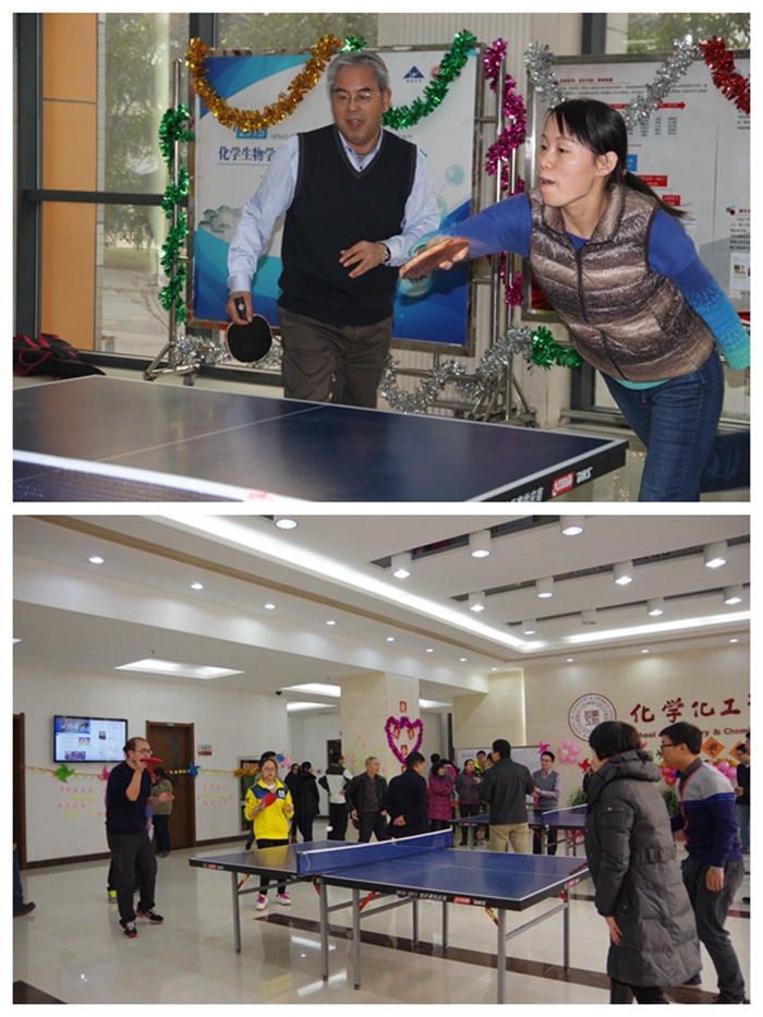 为喜迎2016年元旦的到来,丰富师生的业余生活,增进师生感情,激发全体师生团结拼搏、积极向上的协作意识和团队精神,2015年12月30日至31日,院工会联合院团委在学院一层大厅举办了主题为“化院师生情,爱乒才会赢”的师生乒乓球友谊赛。