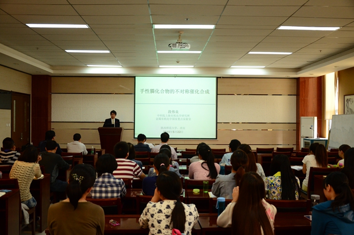 5月22日上午,中国科学院上海有机所段伟良研究员应邀在致知楼1668报告厅为我院师生作了一场题为“手性膦化合物的不对称催化合成”的精彩报告。报告会由副院长薛东教授主持,我院杨俊、王超、李楠、黄治炎、赵玉明、王涛、俞斌勋、李超群等有机教研室老师及相关专业四十多位研究生聆听了报告。
