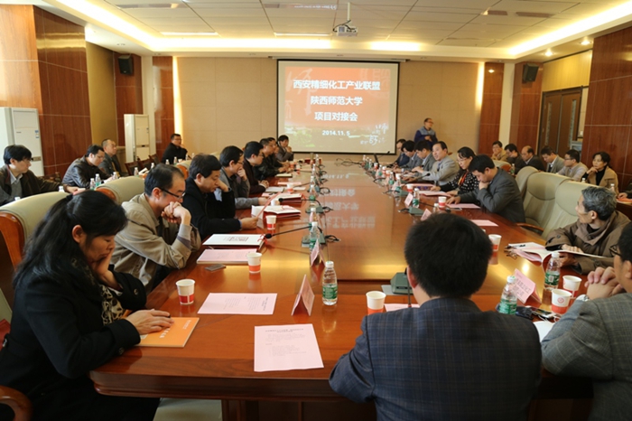 11月5日,陕西师范大学与西安精细化工产业联盟企业项目对接会在我院隆重召开。本次会议由西安精细化工产业联盟秘书处--西安地区科技交流中心与我校联合举办,西安精细化工联盟成员西安西光精细化工有限责任公司、西安道尔达化工有限公司等17家企业,30余人参加了对接会。西安精细化工产业联盟秘书长、西安地区科技交流中心副主任李建忠及陕西师范大学校长助理杨祖培教授出席了此次会议。科技处处长吴晓军,副处长张卫兵、陈新兵,化学化工学院院长高子伟、分党委书记高玲香、副院长薛东以及我院部分教师代表也参加了会议。会议由高子伟院长主持。杨祖培教授在致辞中肯定了这次项目对接会的意义,认为这是我校首次大规模组织企业到学校对接、交流、考察,对促进学校科技开发、成果转化,尤其在推进校企之间产学研合作及科技成果就地转化有着积极的作用。同时杨助理还就我校的人才培养和科学研究的基本情况进行了介绍,并对我校化学化工学科、材料学科的研究和开发情况作了专门推介。