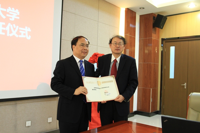 首先,我校校长助理杨祖培与中石化洛阳分公司首席专家李彬签订了校企联合实验室建设协议书,程光旭校长与赵振辉总经理为校企联合实验室揭牌。未来,校企联合实验室将围绕科技研发、人才培养及成果转化等合作内容,深度开展产学研用协同攻关。随后,我校人事处处长李磊宣读了关于聘任赵振辉总经理为我校兼职教授的决定,程光旭校长向赵振辉总经理颁发了聘书。接着,我院院长高子伟与中石化洛阳分公司人力资源处处长陈建国签订实习基地合作协议书,洛阳石化公司成为了我院非师范专业本科生实习实践基地。