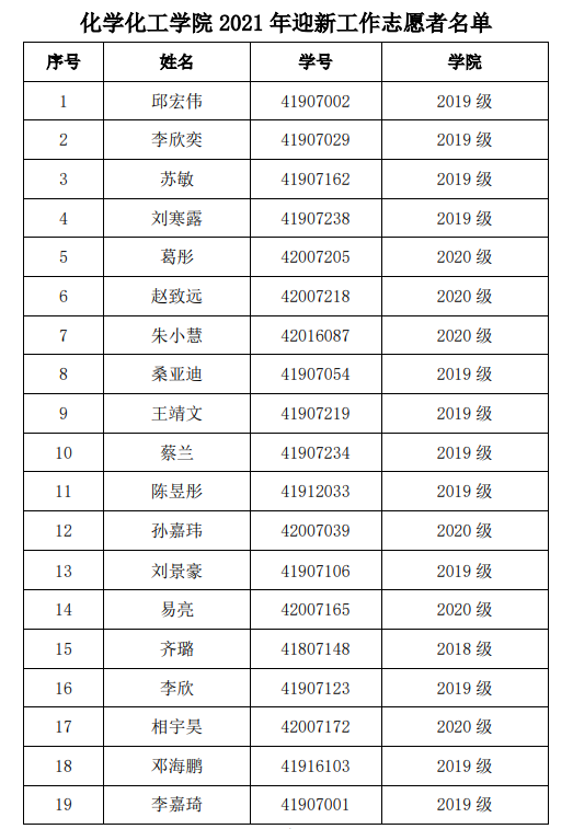 根据《关于招募化学化工学院2021年迎新工作志愿者的通知》要求,按照化学化工学院2021年迎新志愿者招募条件,通过公开招募、自愿报名、择优录取,拟定邱宏伟等58名同学为活动志愿者,现予以公示。