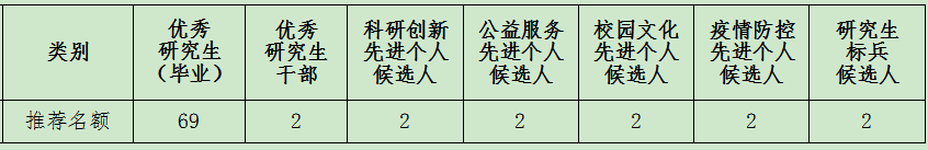 1.个人奖项:优秀研究生(优秀毕业研究生)、优秀研究生干部、科研创新先进个人、公益服务先进个人、校园文化先进个人、研究生标兵。