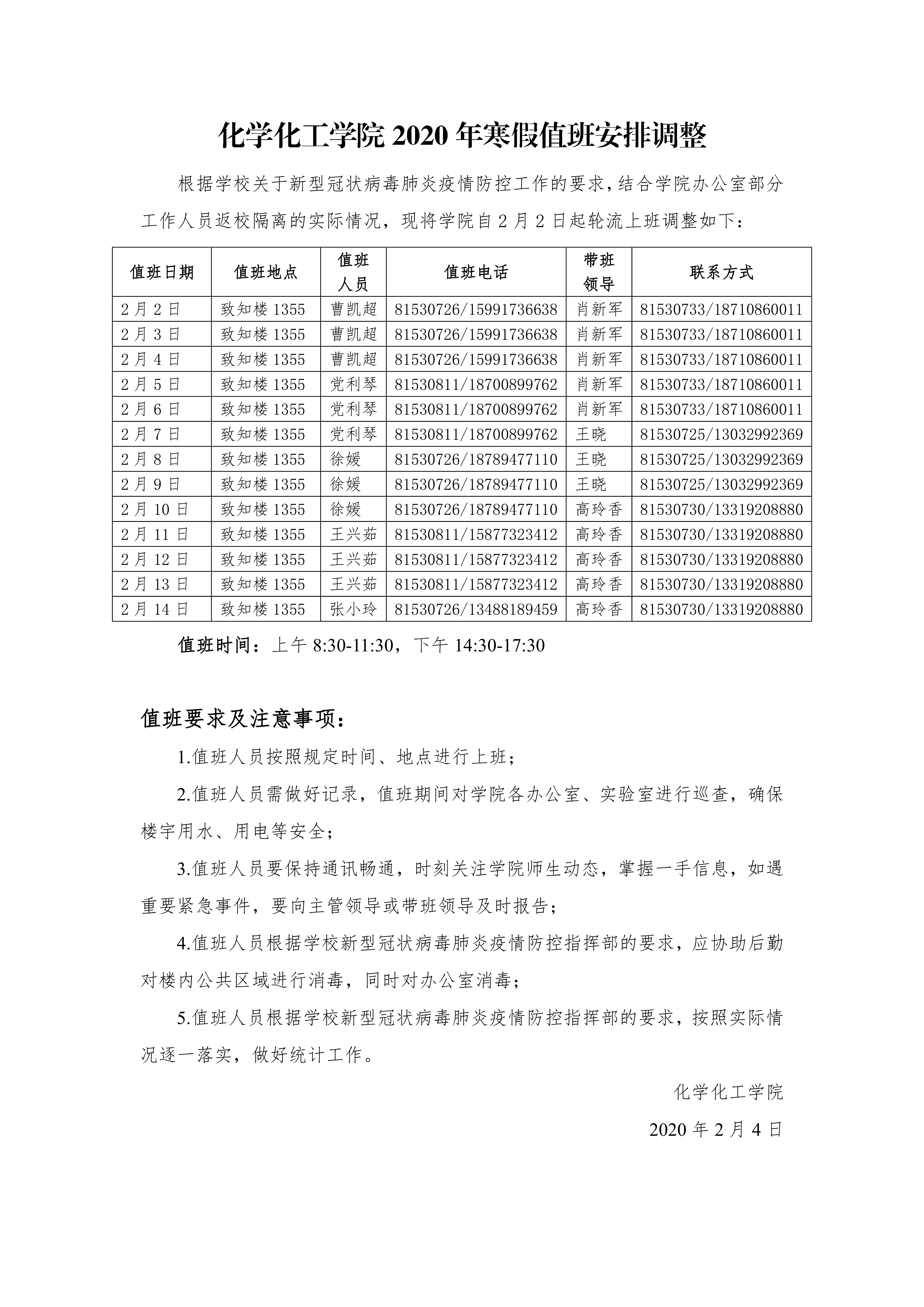 化学化工学院2020年寒假值班安排调整