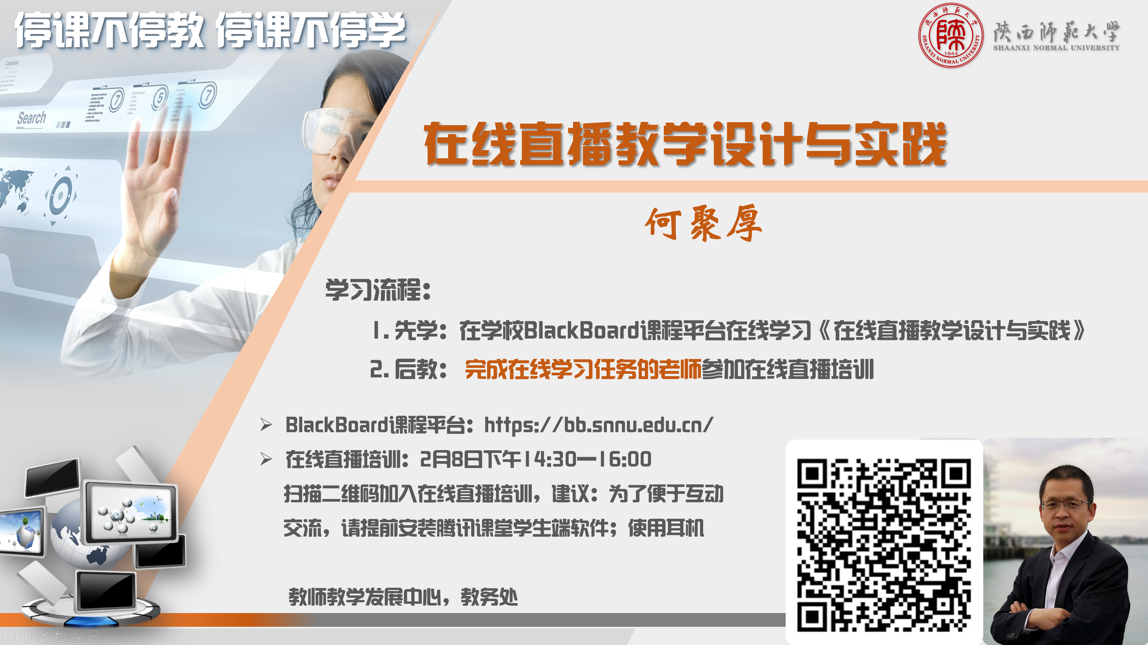 指导课程分为“线上课程自学”和“线上直播培训”两部分。请各位老师提前开展线上课程自主学习(登陆bb平台,进去该课程学习,我校全体教师均已添加为该课程学生),带着问题参与2月8日下午14:30-16:00的在线直播培训,直播培训时主要以解决老师们的问题和直播展示为主,不再重复讲授线上课程的内容。各位老师在线上课程学习过程中,可以在线课程讨论区提问,何老师团队会线上回复,便于问题和回答内容的共享。