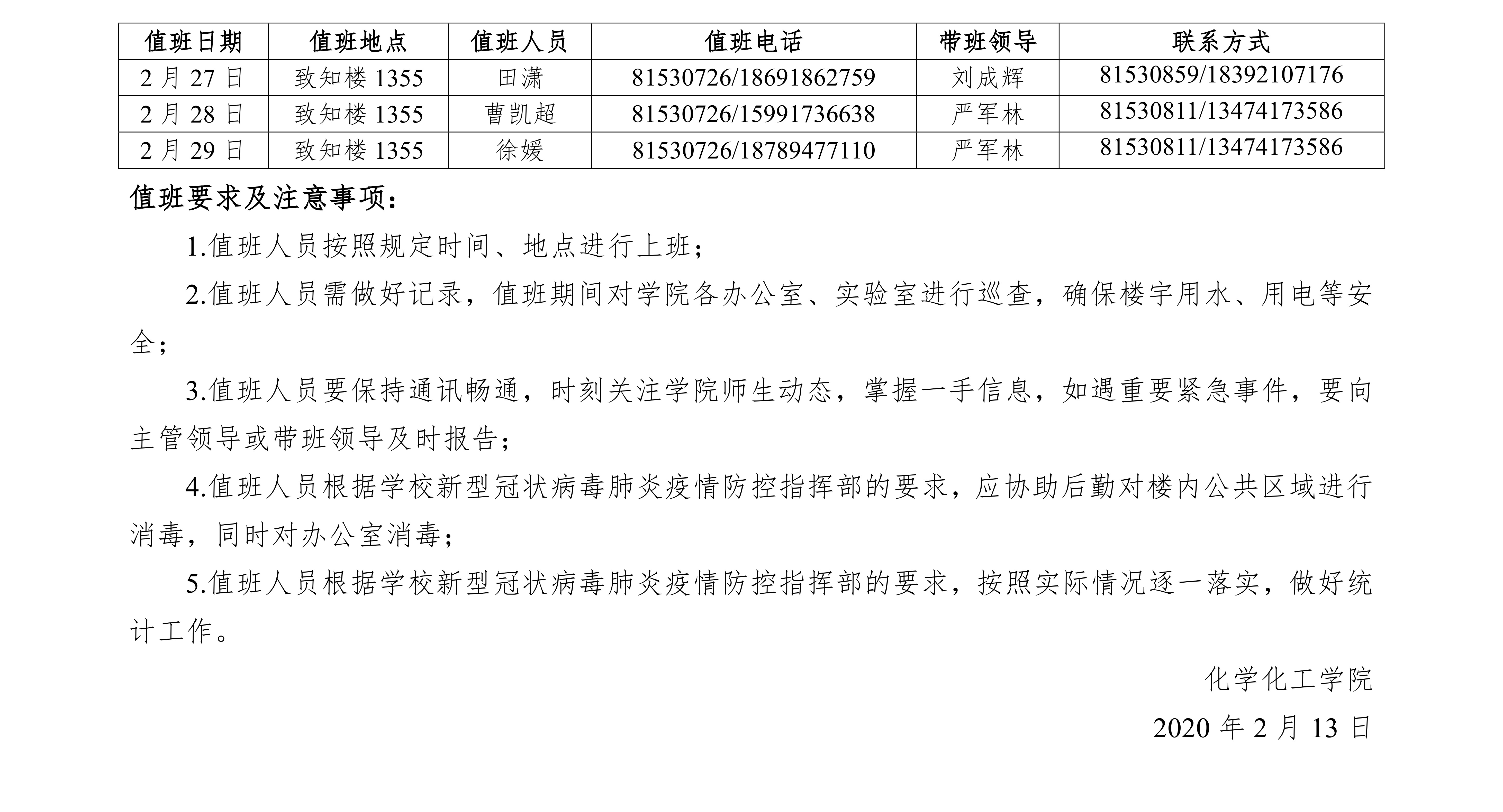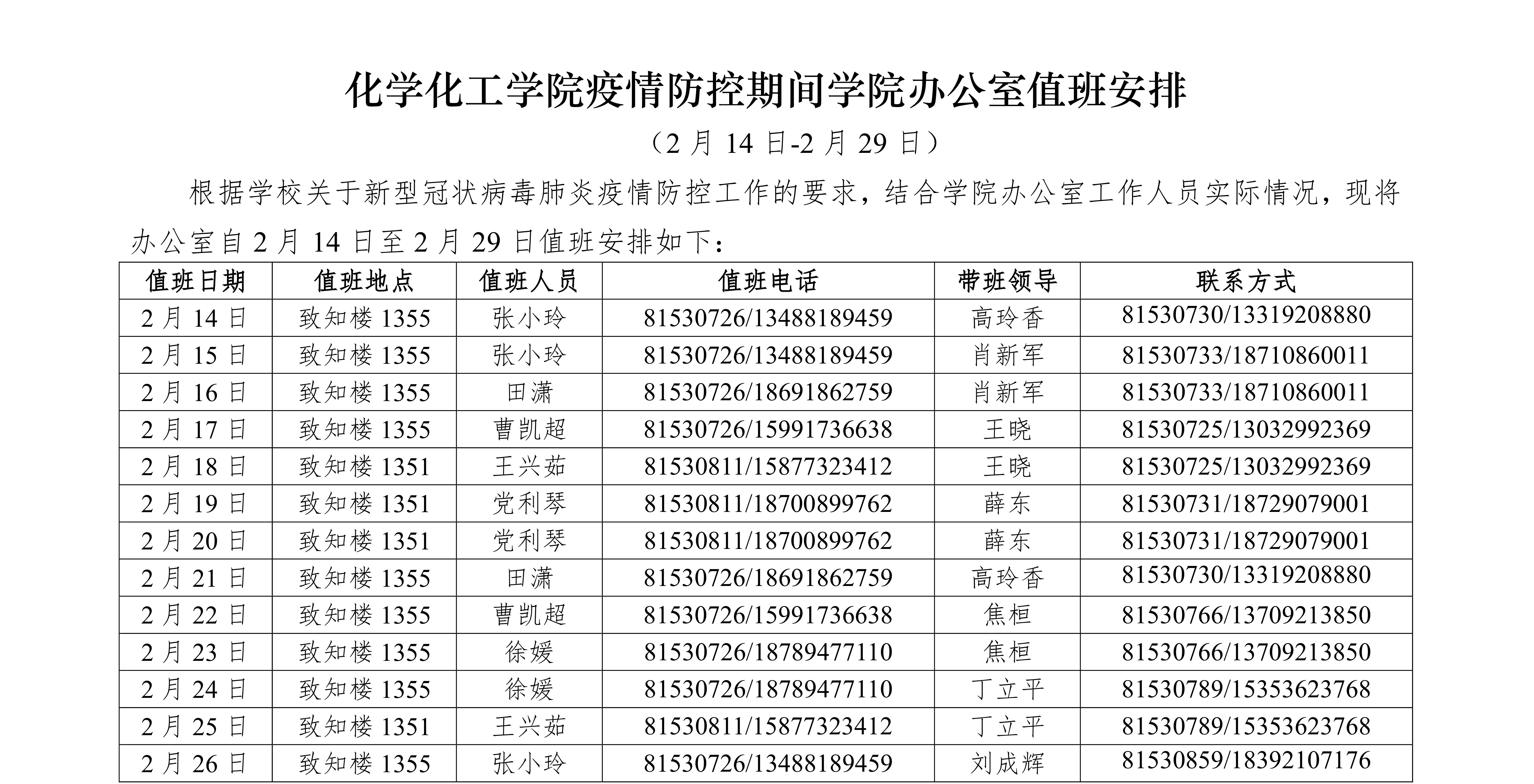 化学化工学院疫情防控期间学院办公室值班安排 (2月14日-2月29日)