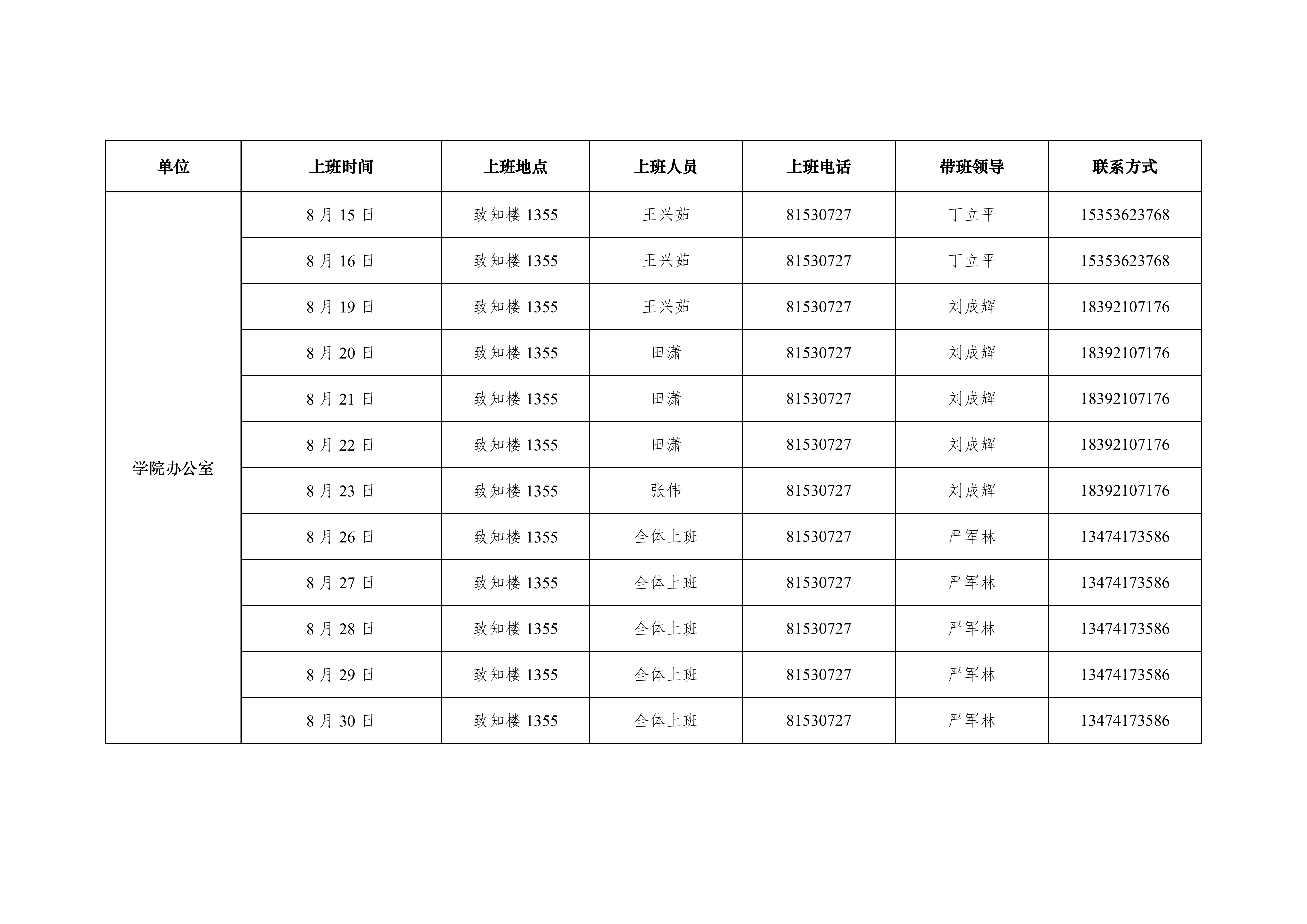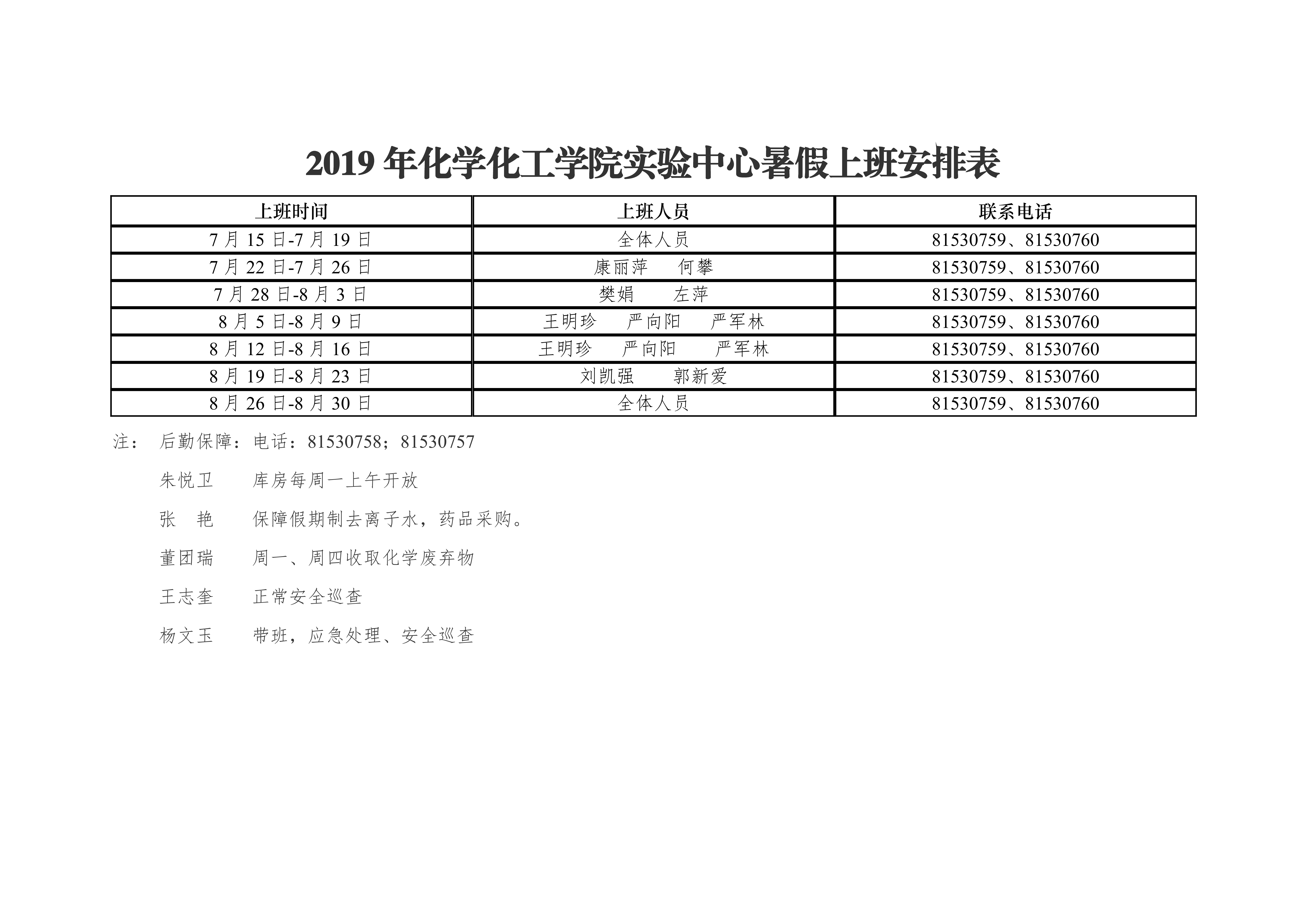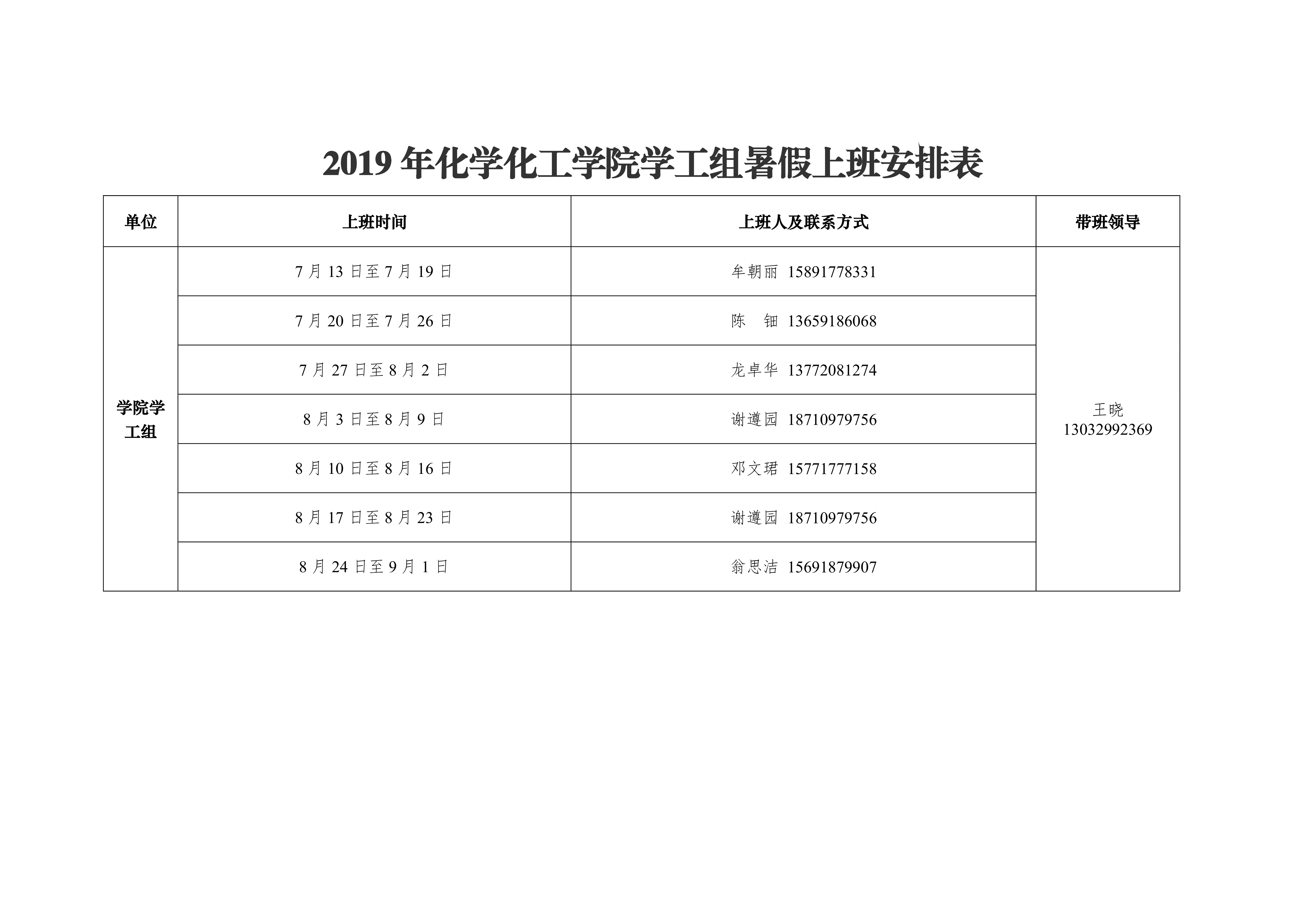 2019年化学化工学院办公室暑假上班安排表