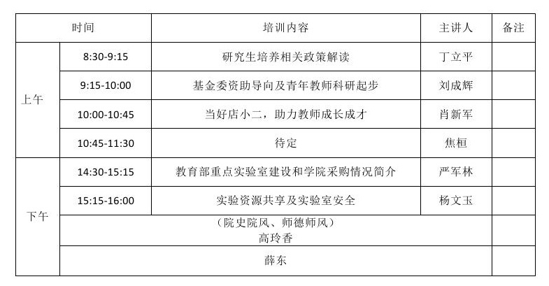 为帮助新入职的教师全面了解学院,尽快适应学院的发展,学院定于8月30日(上午8:30-11:30,下午14:30-17:30)在1362会议室举行新入职教师培训会(2016年1月1日之后入职),主要包括院史院风、师德师风、人才培养、科学研究、学科建设、社会服务、安全教育和实验室建设、管理规定和职业规划等方面的内容。请近三年新入职的教师按时参加。