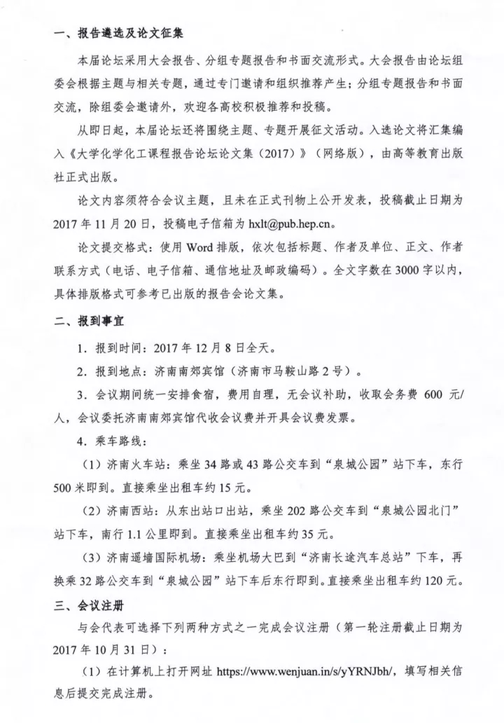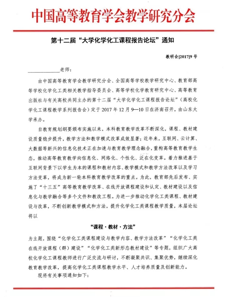 第十二届“大学化学化工课程报告论坛”(高校化学化工课程教学系列报告会)定于12月9-10日在山东济南南郊宾馆召开,由山东大学承办。