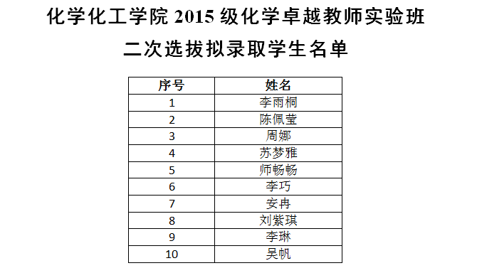 按照《陕西师范大学卓越教师实验班中期考核、二次选拔实施办法》、《化学化工学院2015级卓越教师实验班中期考核、二次选拔考核方案》,经学院二次选拔考核,拟录取学生名单如下: