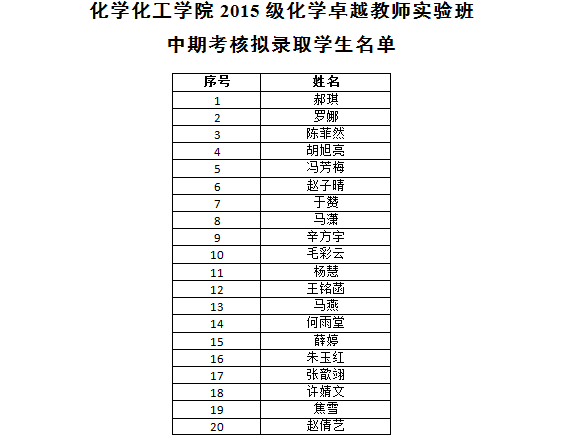 按照《陕西师范大学卓越教师实验班中期考核、二次选拔实施办法》、《化学化工学院2015级卓越教师实验班中期考核、二次选拔考核方案》,学院对2015级卓越教师实验班学生进行了中期考核,通过考核,拟录取学生名单如下: